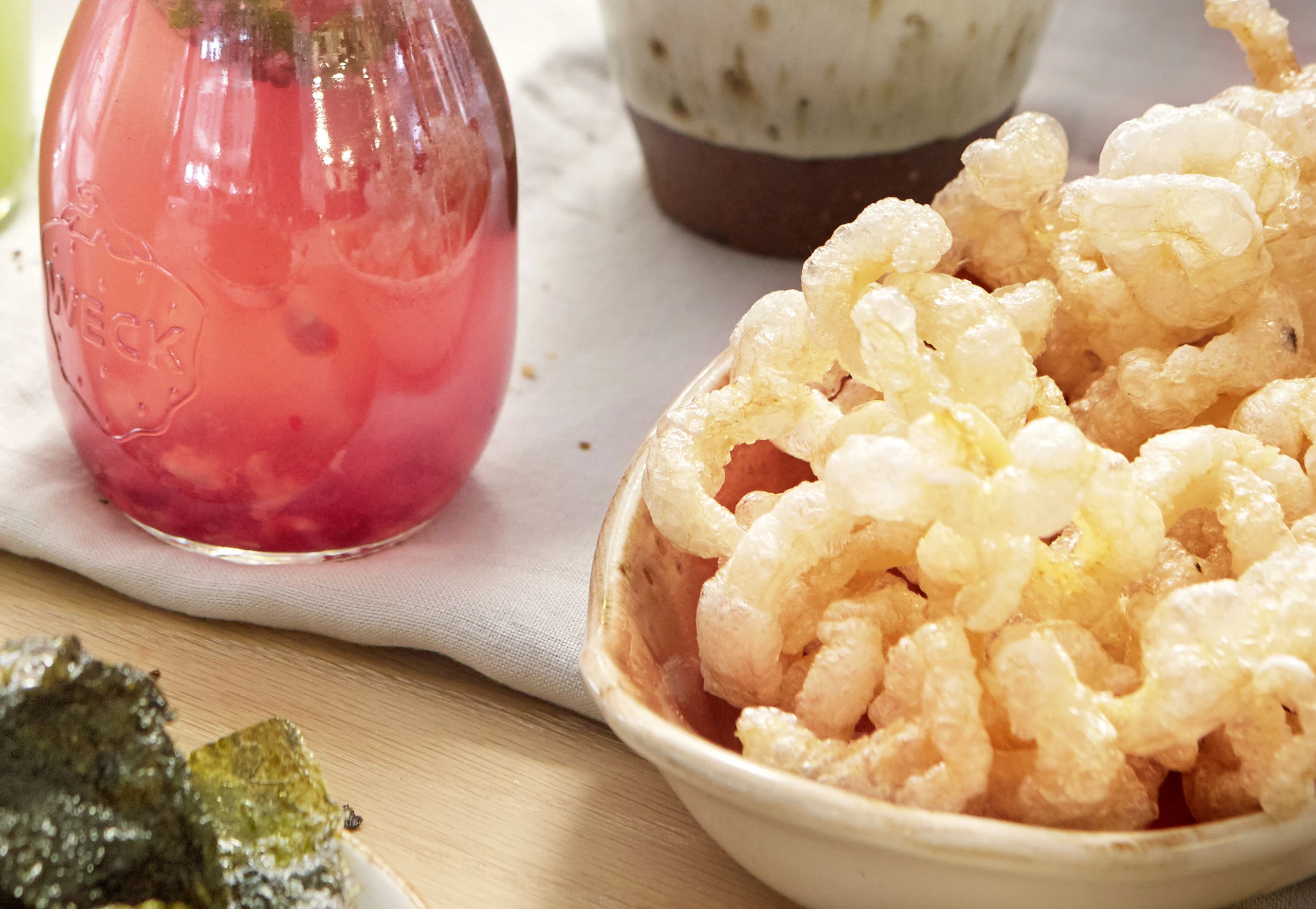 Schwarten auf einem Gitter verteilen, über Nacht trocknen lassen. In einem Topf ca. 3 cm hoch Öl auf 180 °C erhitzen, Schwarten darin frittieren, bis sie wie Popcorn aufgehen (ca. 3 Minuten). Herausnehmen und auf Küchenpapier abtropfen lassen.