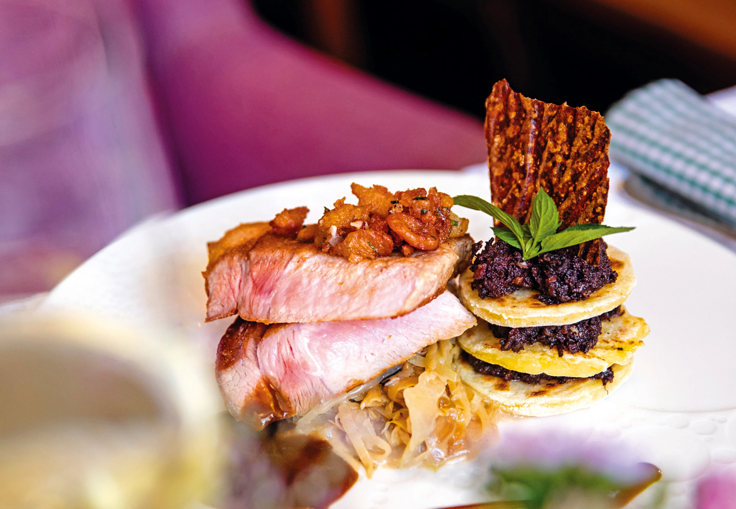 Schweinssteak mit Kümmelsafterl und Blunzen-Lasagne