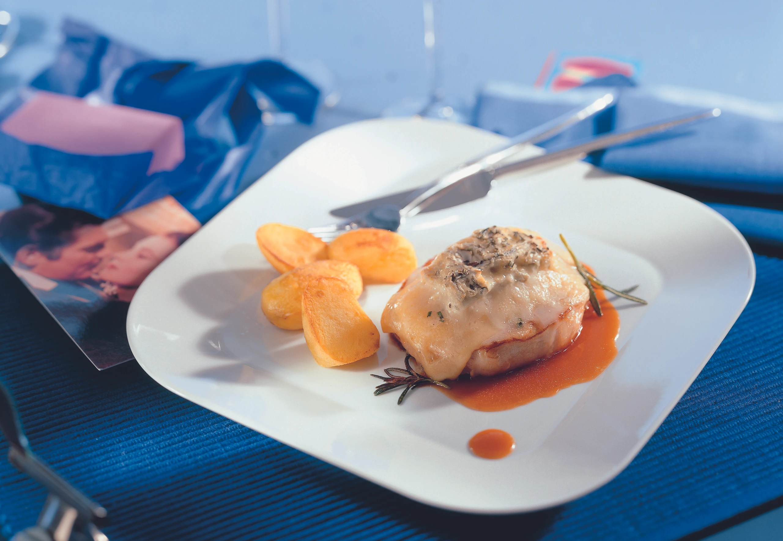Schweinssteak mit Käse und Rosmarin überbacken, dazu Braterdäpfel