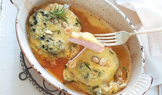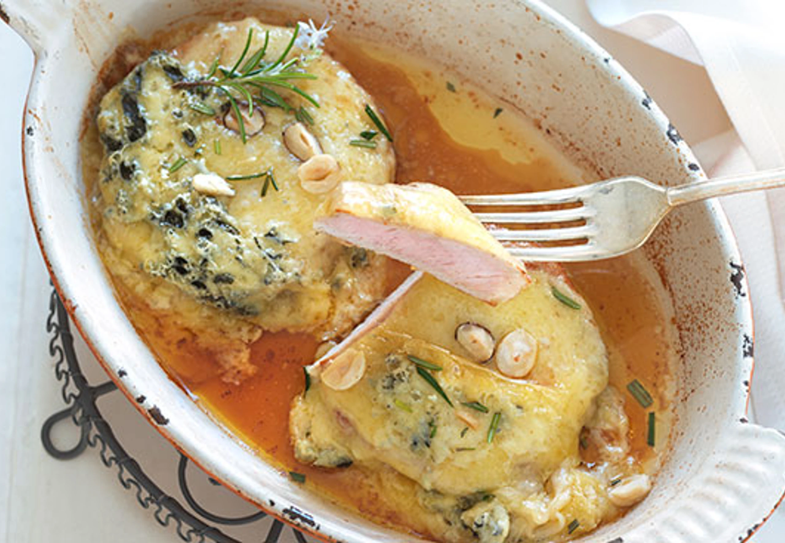 Inzwischen Bratrückstand mit Bratensaft aufgießen und aufkochen. Fleisch zuerst mit Gouda, dann mit Edelschimmelkäse belegen und mit Rosmarin bestreuen. Bratensaft zugießen und die Steaks im Rohr (mittlere Schiene) ca. 10 Minuten backen.