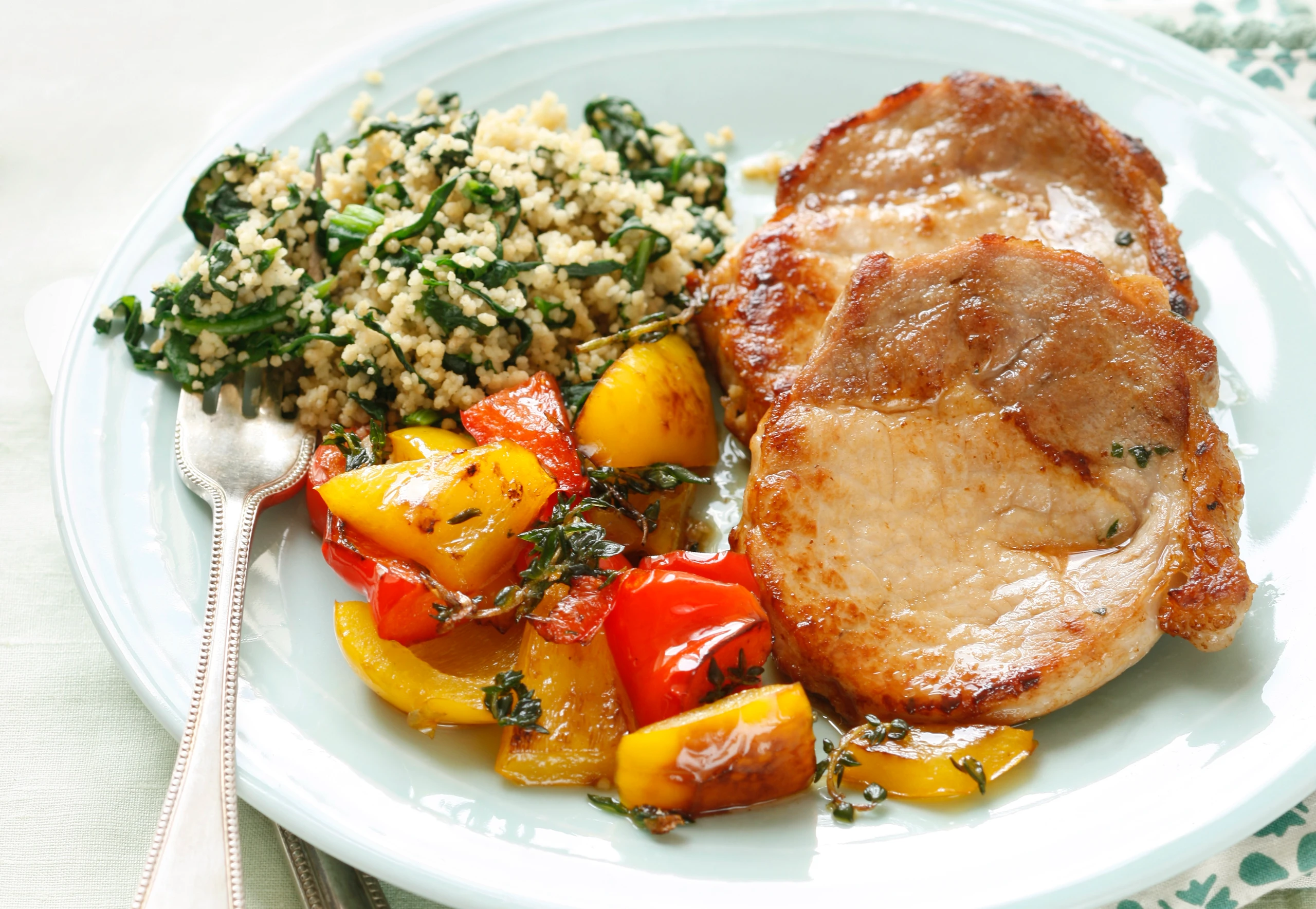 Spinat in Streifen schneiden und in einer heißen Pfanne zugedeckt zusammenfallen lassen (30 Sekunden). Spinat salzen und pfeffern. Suppe mit zerdrücktem Knoblauch aufkochen, vom Herd nehmen, Couscous und 2 EL Öl einrühren und 7 Minuten quellen lassen. Spinat untermischen. Steaks mit Sauce, Paprika und Couscous servieren.