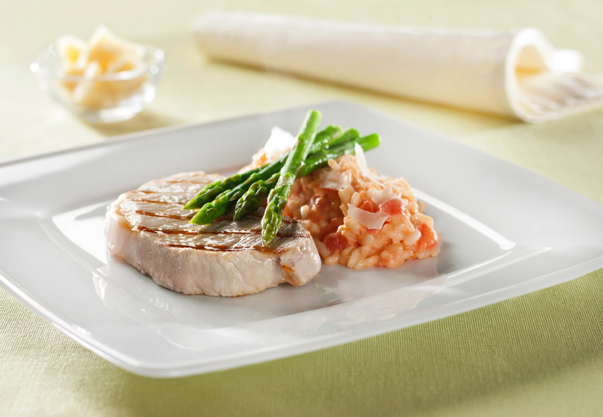 Schweinssteak mit Paradeisrisotto und grünem Spargel