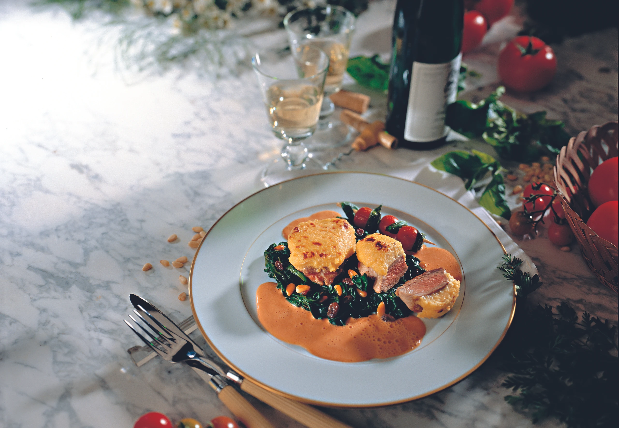 Blattspinat putzen (Blattstiele entfernen), waschen und abtropfen lassen. Butter erhitzen, Rosinen und Pignoli kurz anschwitzen, Spinat zugeben und unter Schwenken zusammenfallen lassen. Spinat mit Salz und Pfeffer würzen.