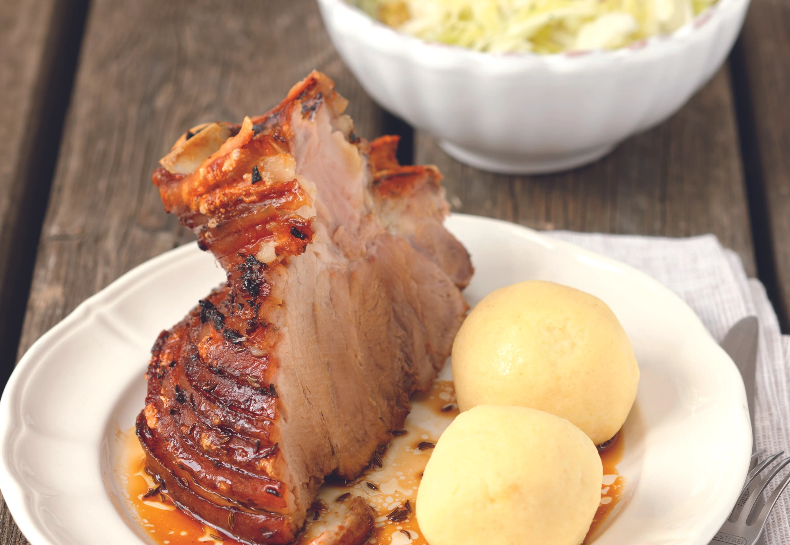 Rohr auf 200°C vorheizen. Pfanne mit 4 EL Öl ausstreichen. Schwarte der Stelzen einschneiden, mit Salz, Kümmel und Knoblauch einreiben. Stelzen in die Pfanne stellen, ins Rohr (untere Schiene / Gitterrost) schieben und knusprig braten (ca. 2 ¼ Stunden).