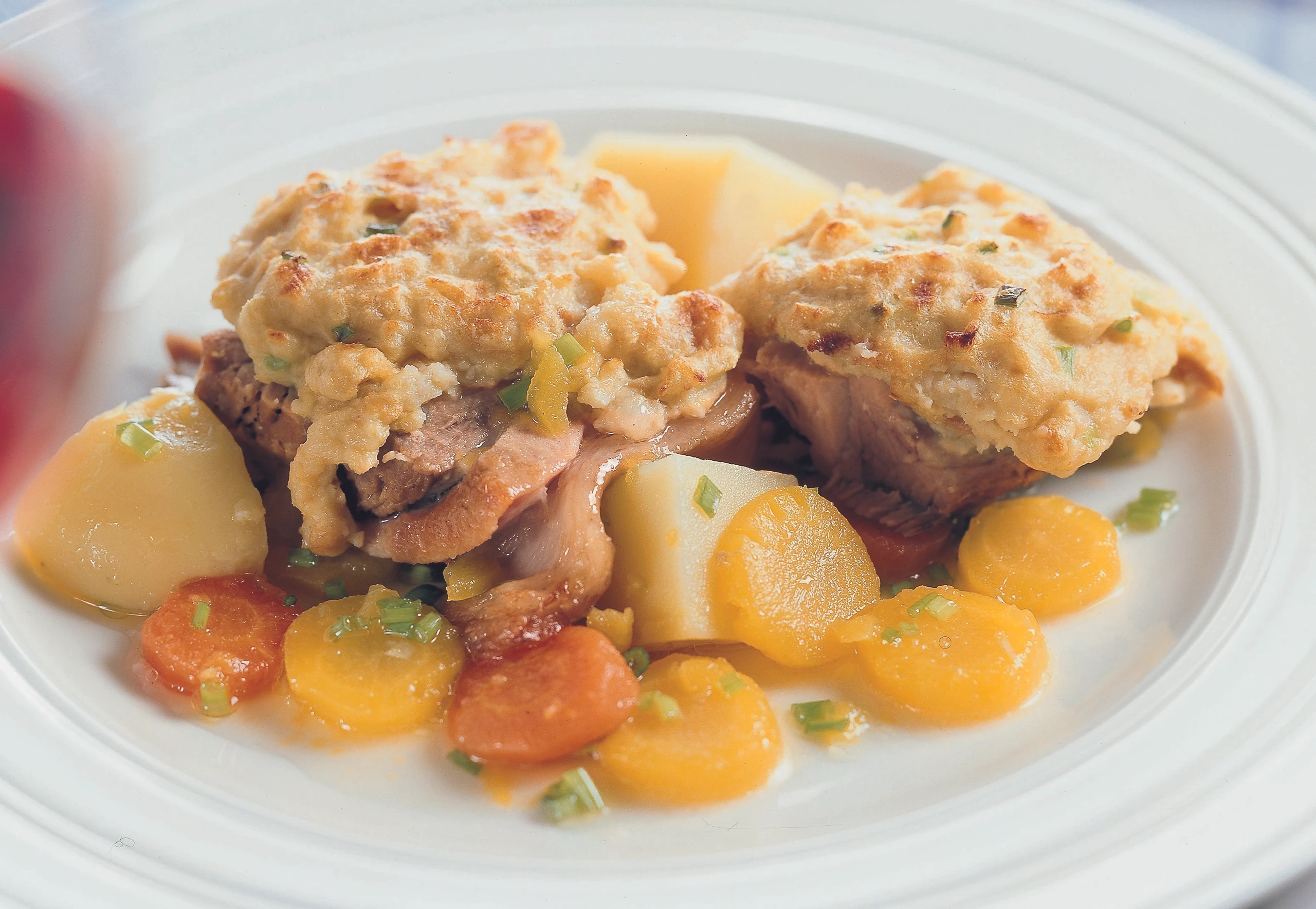 - Inzwischen Suppengemüse in Stücke schneiden und mit wenig Suppe in tiefen Tellern anrichten. Stelzenstücke darauf setzen und mit restlichem Schnittlauch bestreuen. Als Beilage passen Erdäpfel.