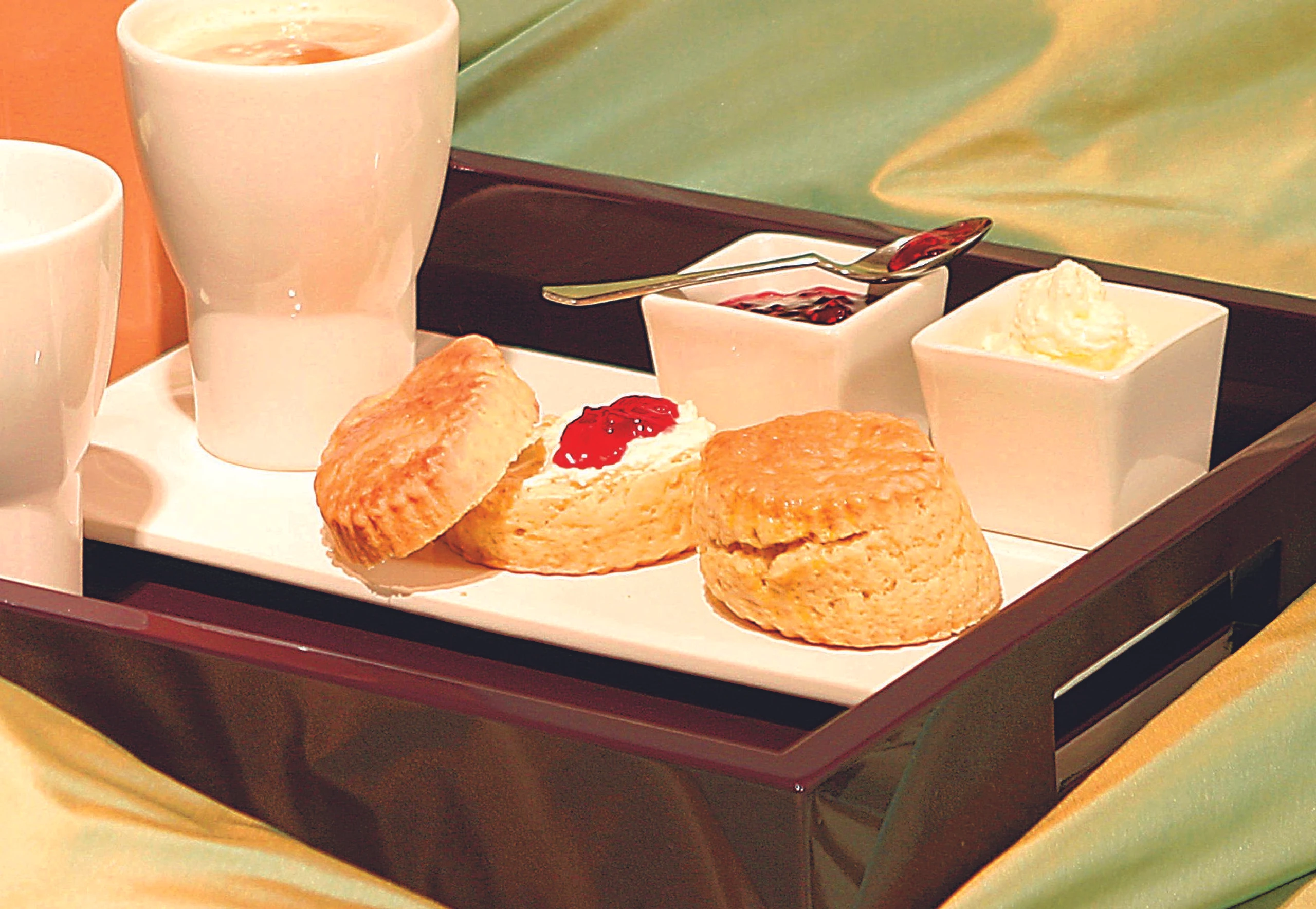 Scones im Rohr (obere Schiene) ca. 20 Minuten nicht zu dunkel backen – sie gehen dabei ca. 4 cm hoch auf. Die noch warmen Scones mit Mascarpone oder Clotted Cream und Erdbeermarmelade servieren.