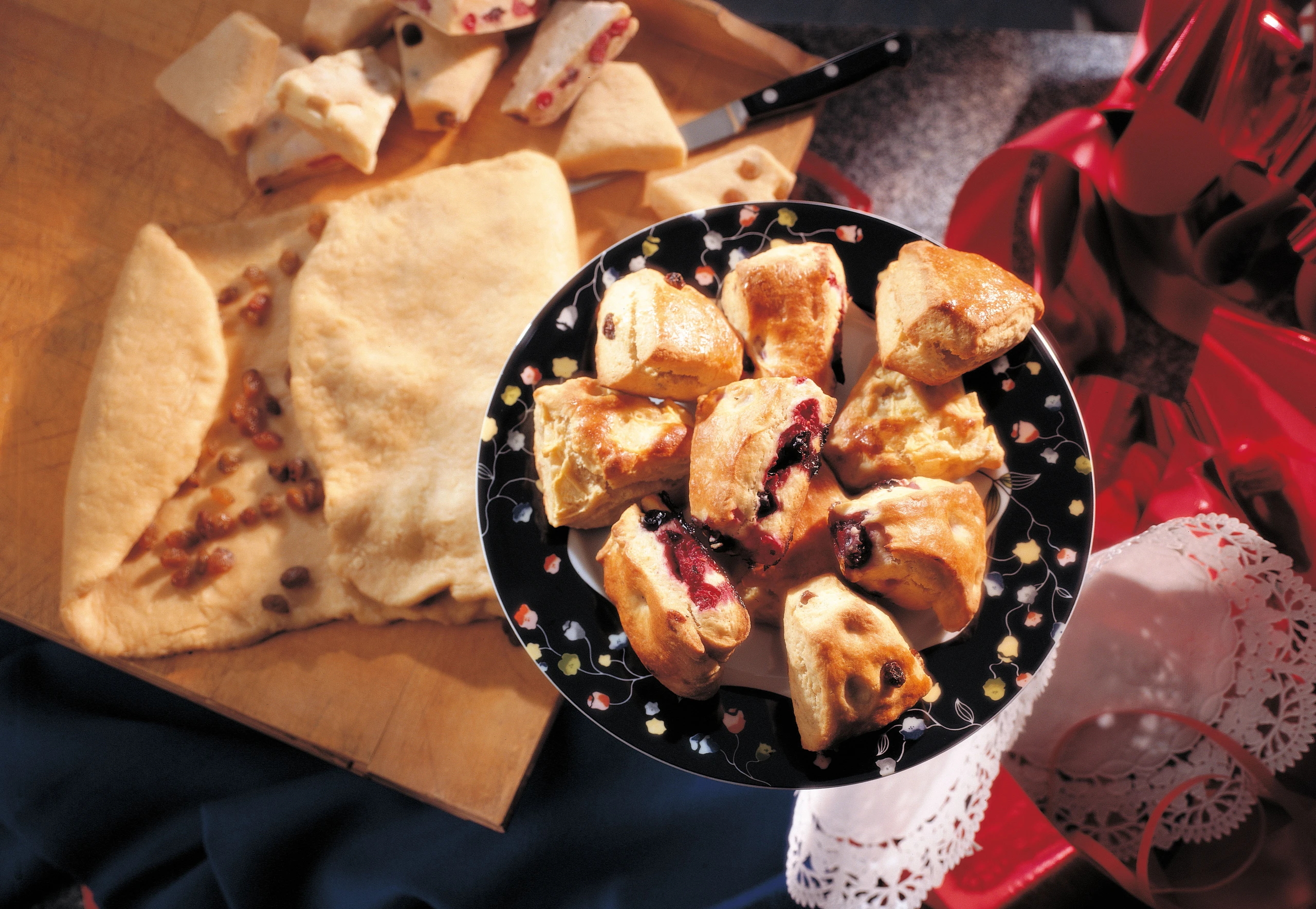 - Rohr auf 170°C vorheizen. Backblech mit Backpapier belegen. Teig auf einer gut bemehlten Arbeitsfläche ca. 3 cm dick ausrollen und daraus 15 Scheiben (Ø 5 cm) ausstechen. Scheiben auf das Backblech legen, mit Dottern dünn bestreichen und im Rohr (mittlere Schiene) 20 Minuten backen. Herausnehmen und auskühlen lassen.