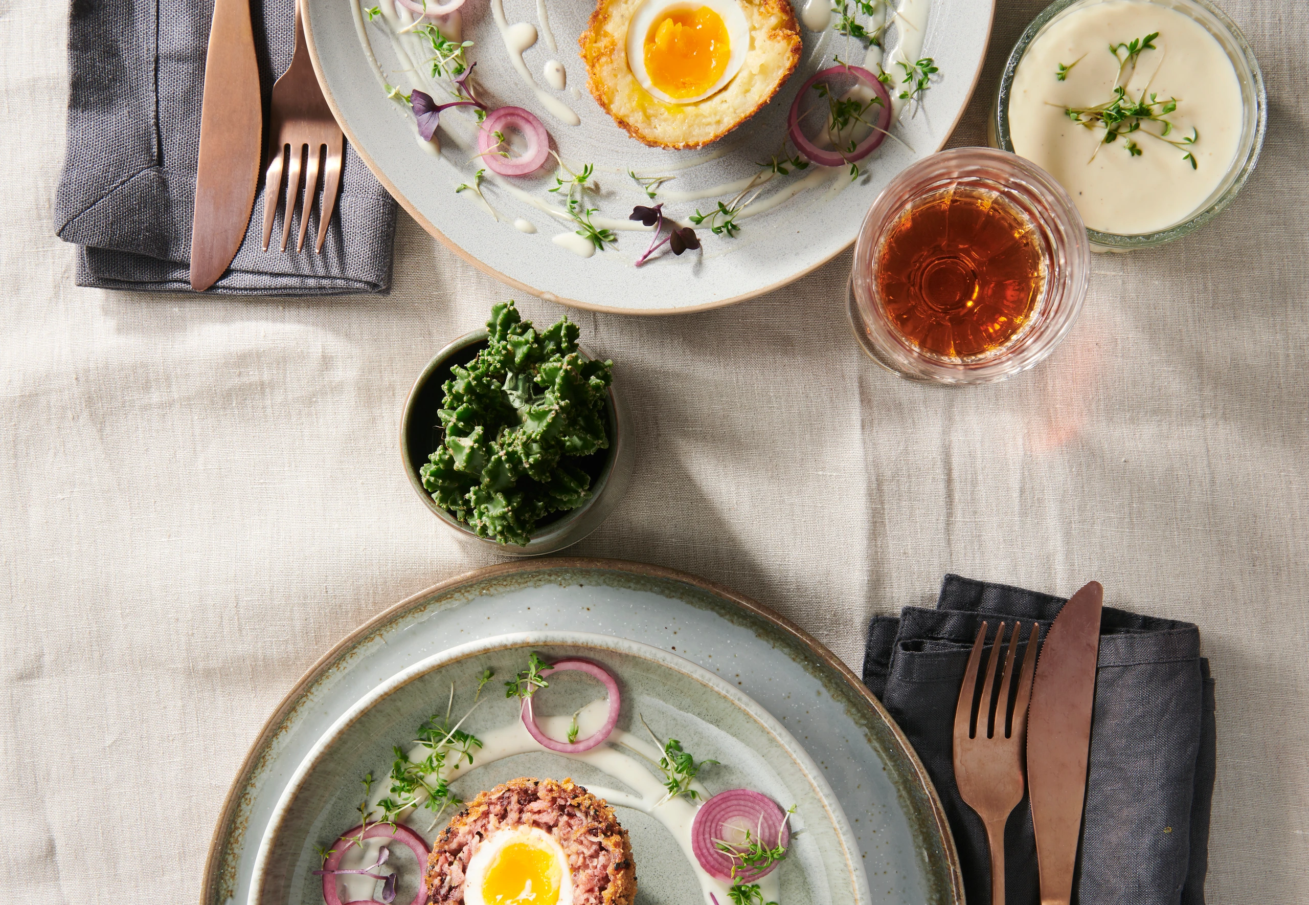 In einem hohen Topf 4 Finger hoch Öl erhitzen. Scotch Eggs darin rundum goldbraun backen, herausnehmen und auf Küchenpapier abtropfen lassen. Mit den eingelegten Zwiebeln, Joghurtmayonnaise und Kresse (siehe Beilagen) anrichten.