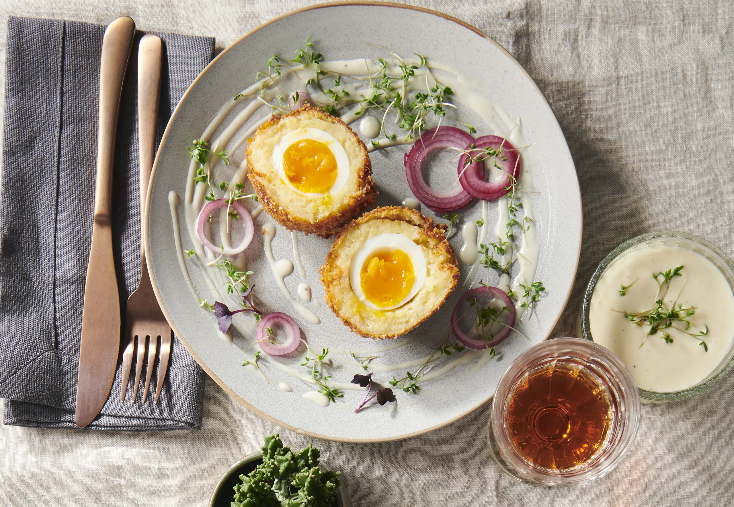 In einem hohen Topf 4 Finger hoch Öl erhitzen. Scotch Eggs darin rundum goldbraun backen, herausnehmen und auf Küchenpapier abtropfen lassen. Mit den eingelegten Zwiebeln, Joghurtmayonnaise und Kresse (siehe Beilagen) anrichten.