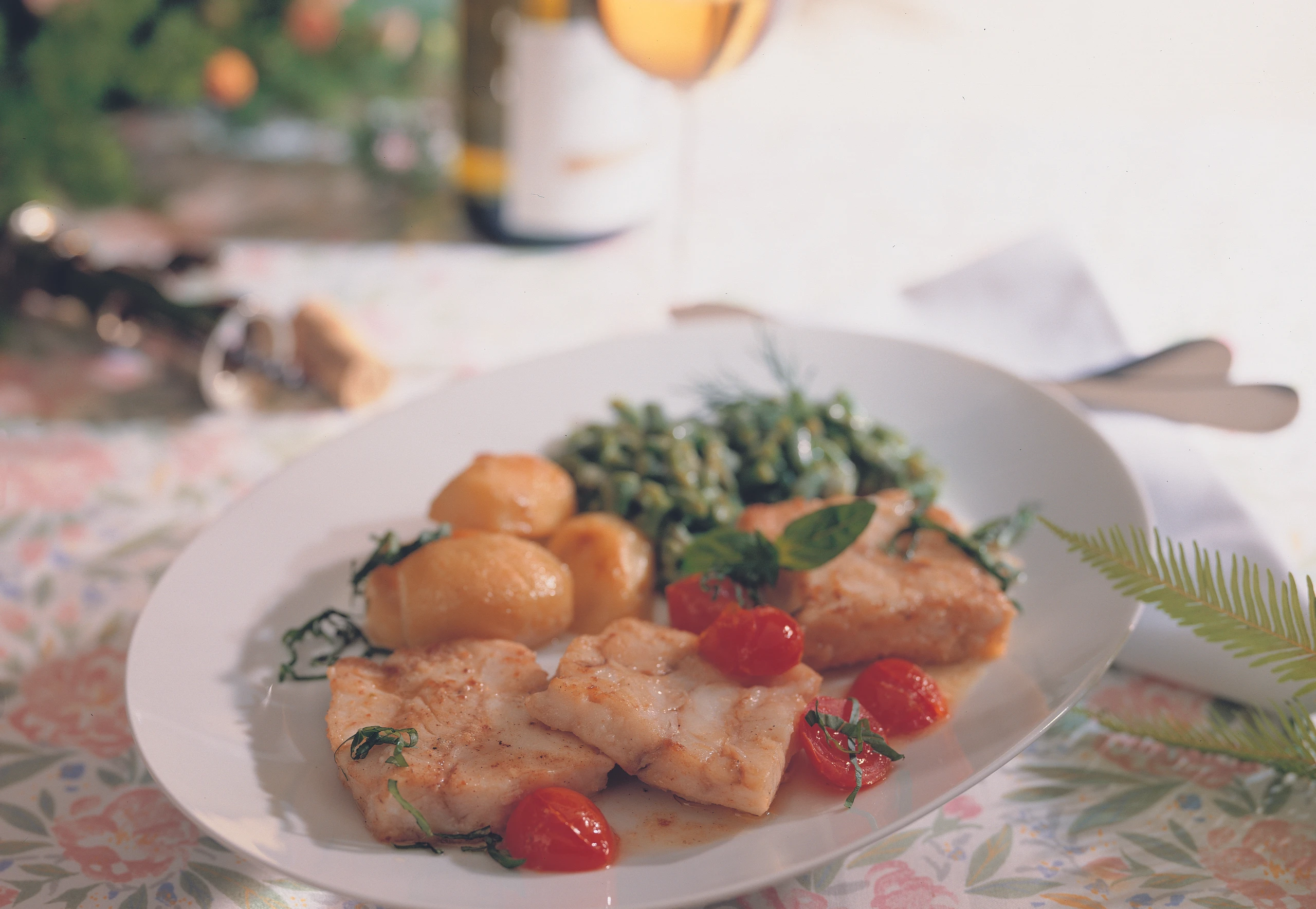 Seehechtfilet auf Rahmfisolen mit Paradeisern