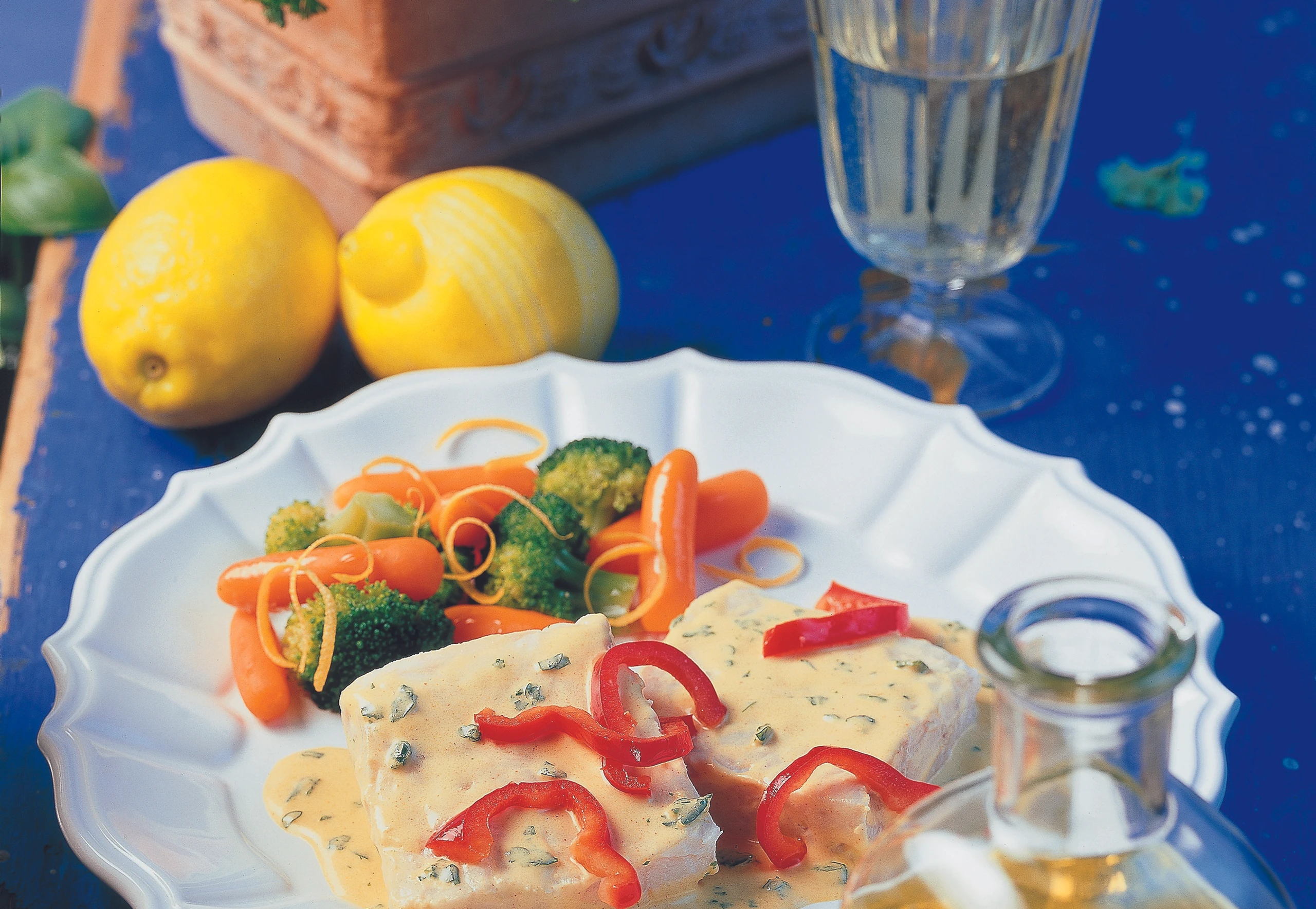 Seelachsfilets in der Petersil-Sauce anrichten und mit Paprikastreifen garnieren. Dazu passt Gemüse mit Zitronenbutter.