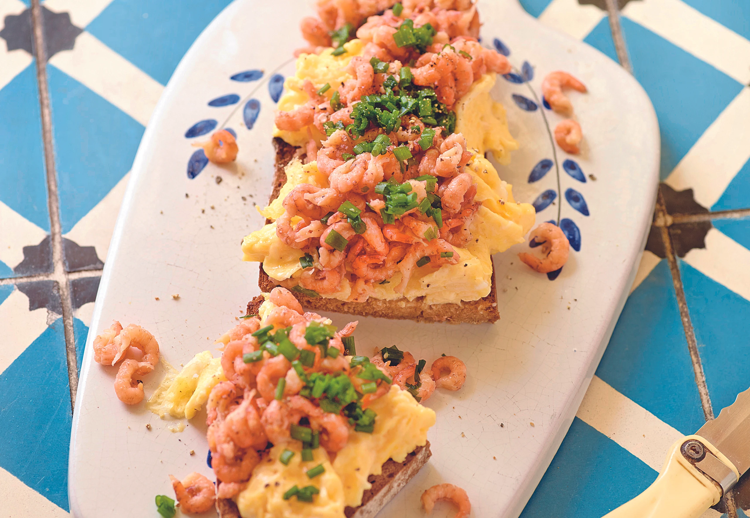 Brote knusprig toasten und mit Butter bestreichen. Rührei auf den Broten verteilen, mit Krabben belegen und mit Schnittlauch und frisch gemahlenem Pfeffer bestreuen.