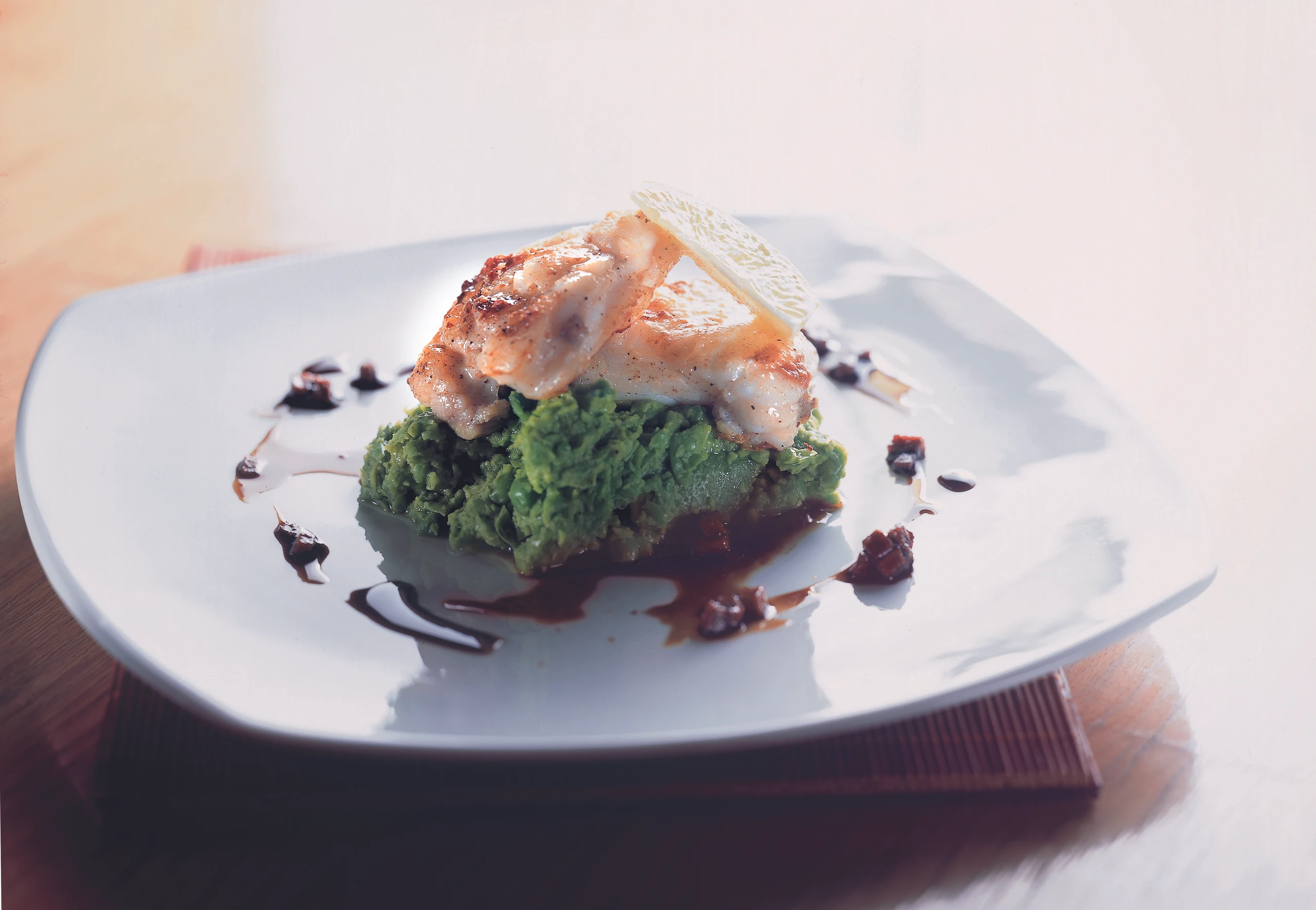 Erwärmtes Erbsenpüree auf Tellern anrichten, Fischstücke darauf setzen und mit Balsamsauce und Limettenspalten garniert servieren.