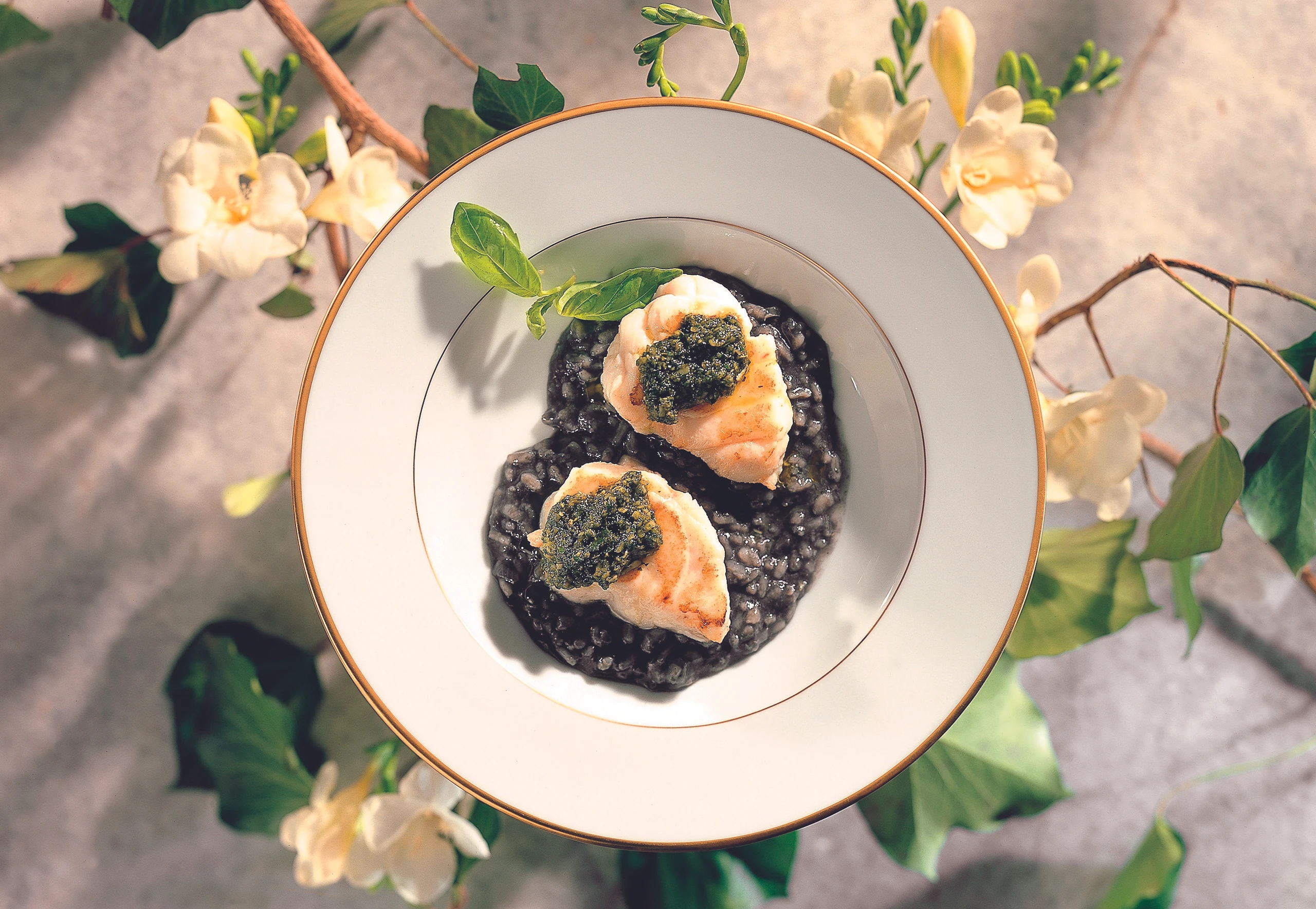 Seeteufel mit Tintenfisch-Risotto und Pesto
