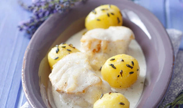 - Fisch aus der Sauce nehmen, Sauce cremig einkochen, mit dem Stabmixer aufschäumen. Fisch mit Sauce und Lavendelerdäpfeln servieren.