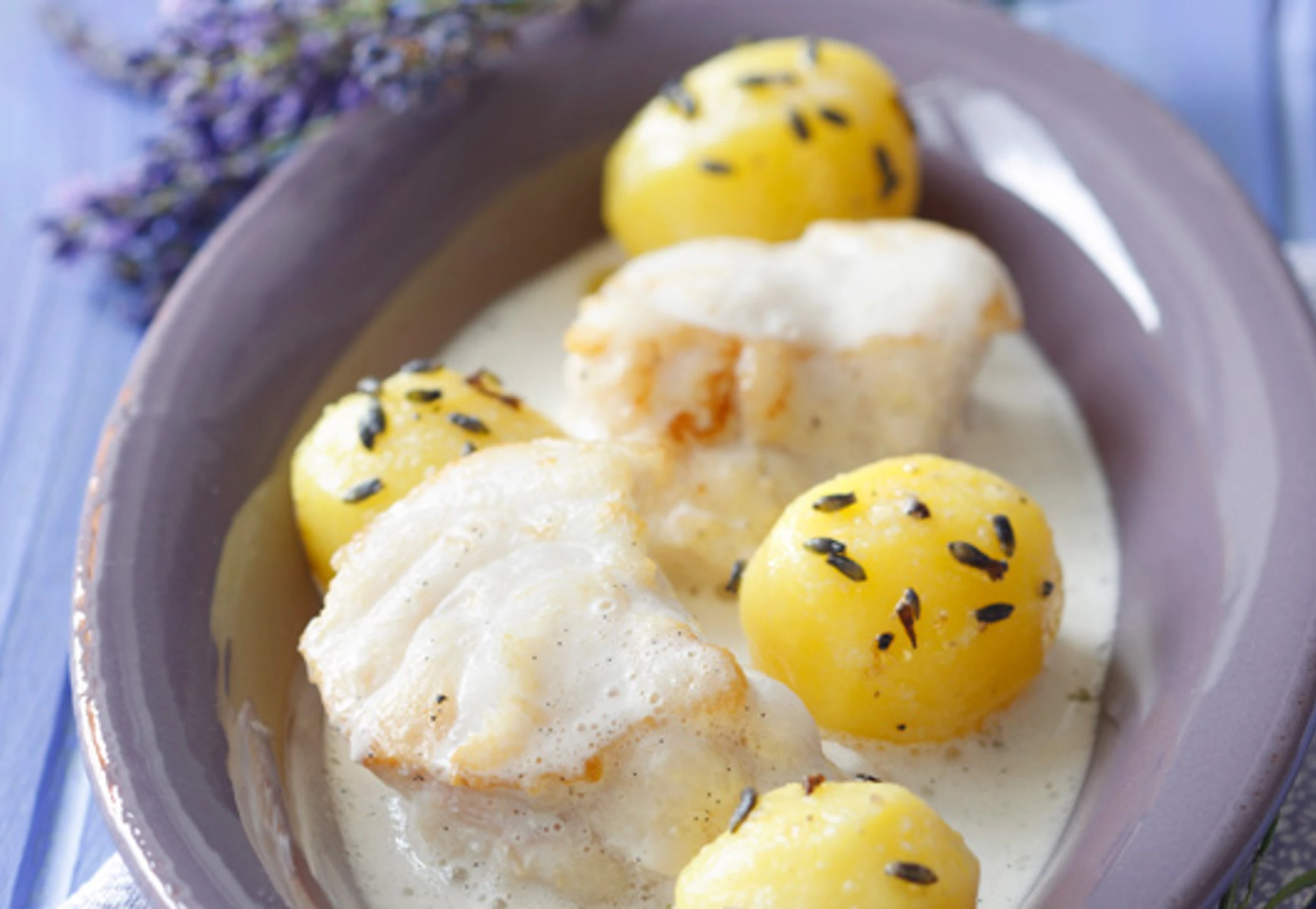 Fisch aus der Sauce nehmen, Sauce cremig einkochen, mit dem Stabmixer aufschäumen. Fisch mit Sauce und Lavendelerdäpfeln servieren.