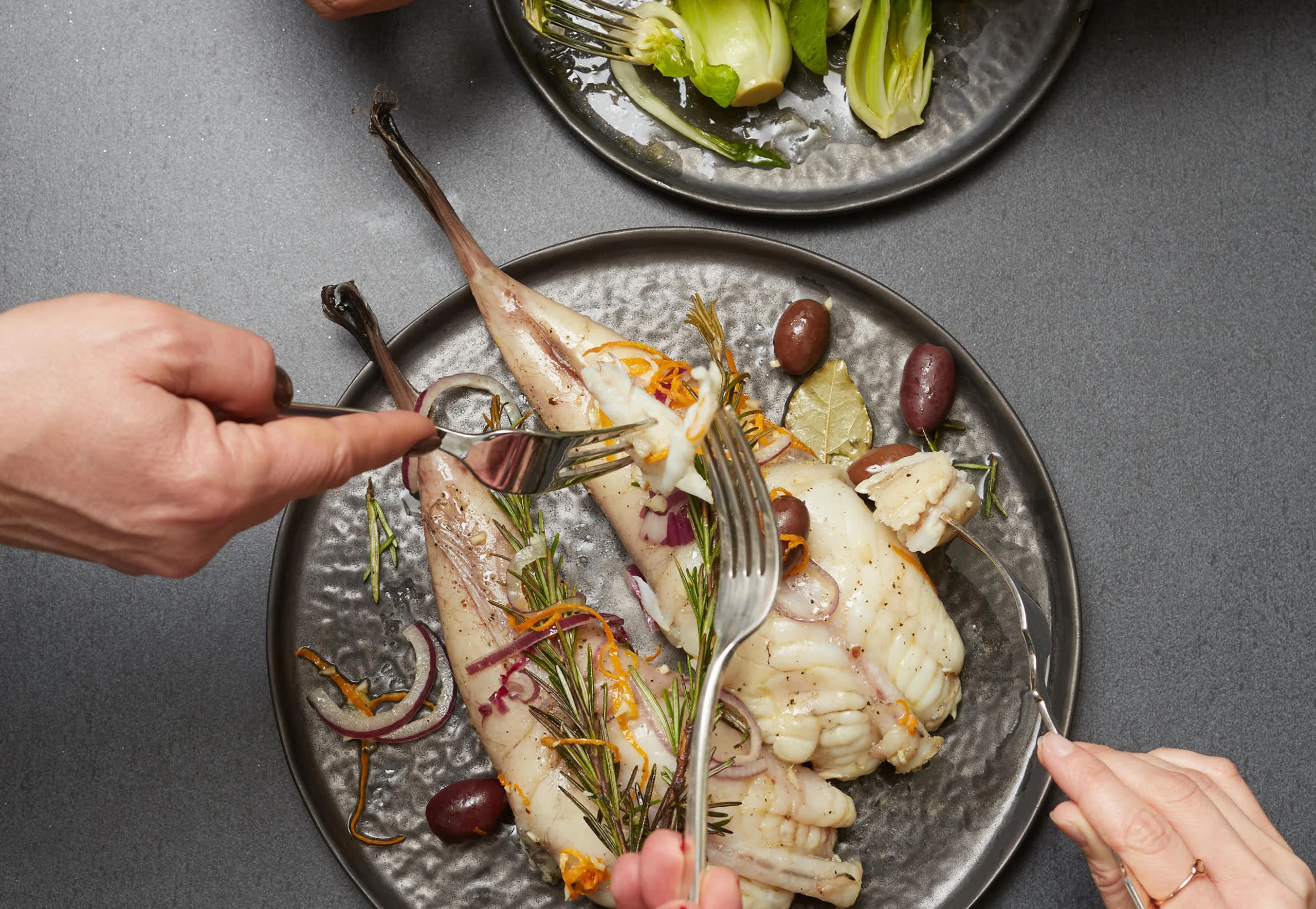 Seeteufel mit Oliven, Orangen und Pak Choi