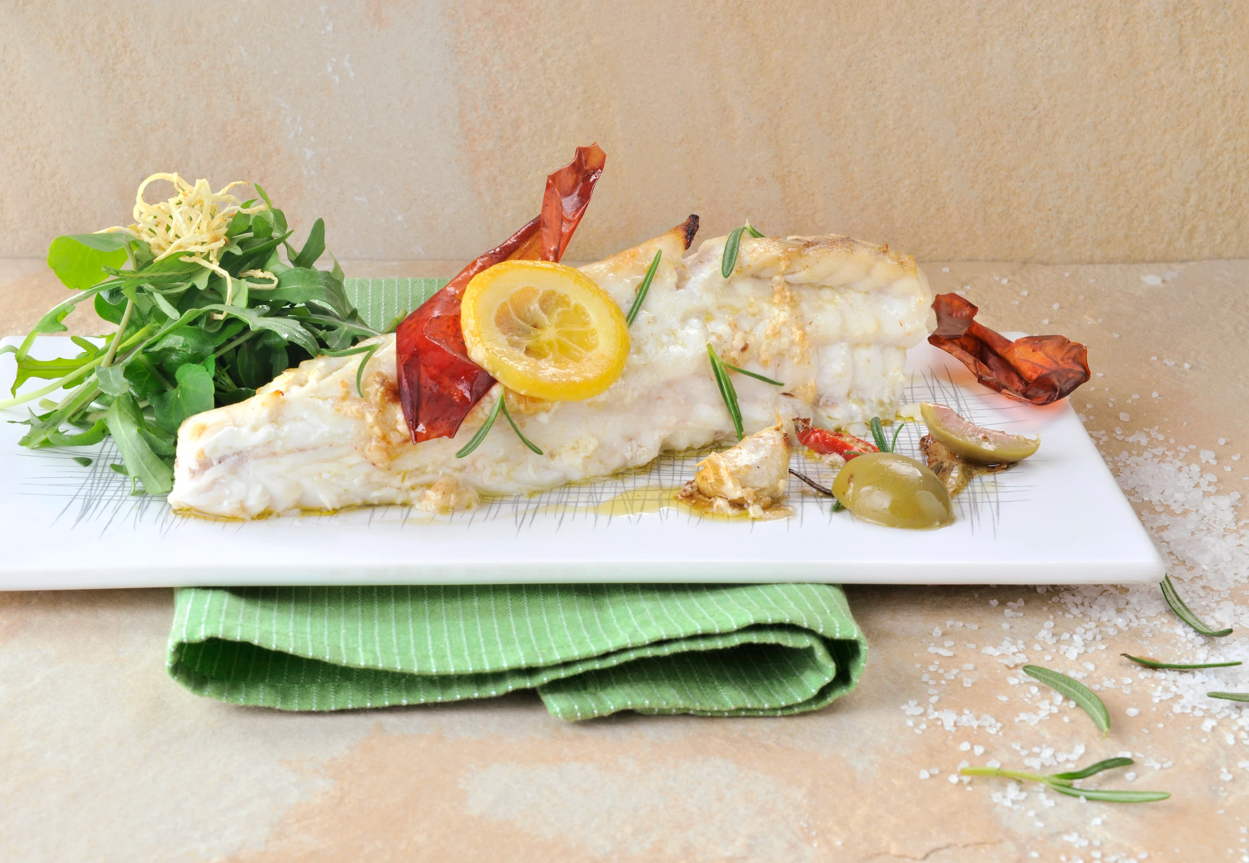 Fisch aus dem Rohr nehmen, Filets entlang des Rückgrates auslösen und portionieren. Fisch mit Oliven, Zitrusscheiben, Chilis, Knoblauch und Schmorfond anrichten, mit dem Salat servieren.