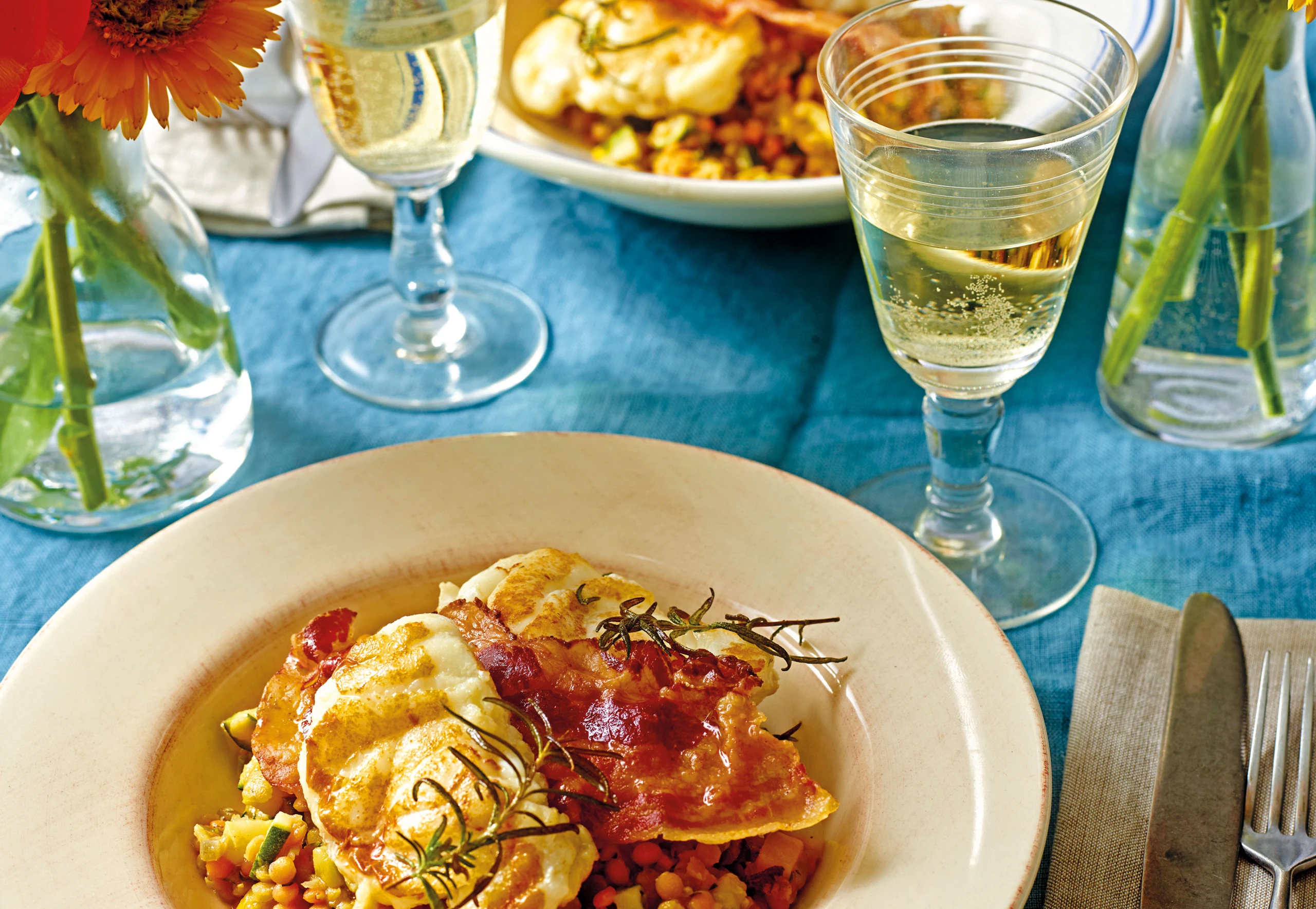 Medaillons mit dem Gemüse anrichten, mit Zitronensaft beträufeln und mit Pancetta und Rosmarin garniert servieren.