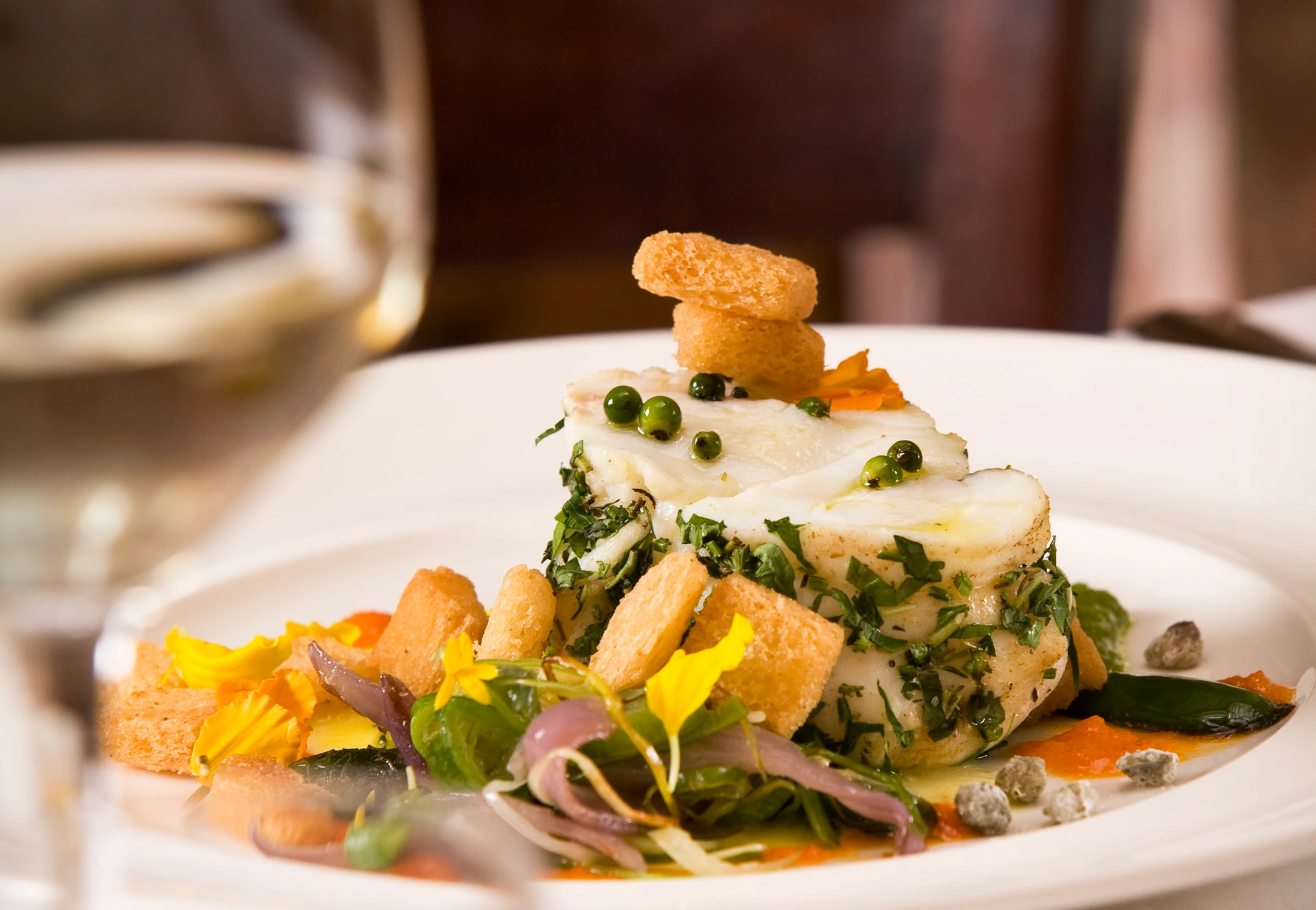 Für die Garnitur Knoblauch, Pfefferkörner und Kräuter in Butter anbraten. Seeteufel einlegen und darin unter öfterem Wenden und Übergießen mit Sauce erwärmen. Seeteufel mit dem Salat anrichten, mit Saucen und Pesto beträufelt servieren. Eventuell zusätzlich mit Blüten und Salzkapern garnieren.