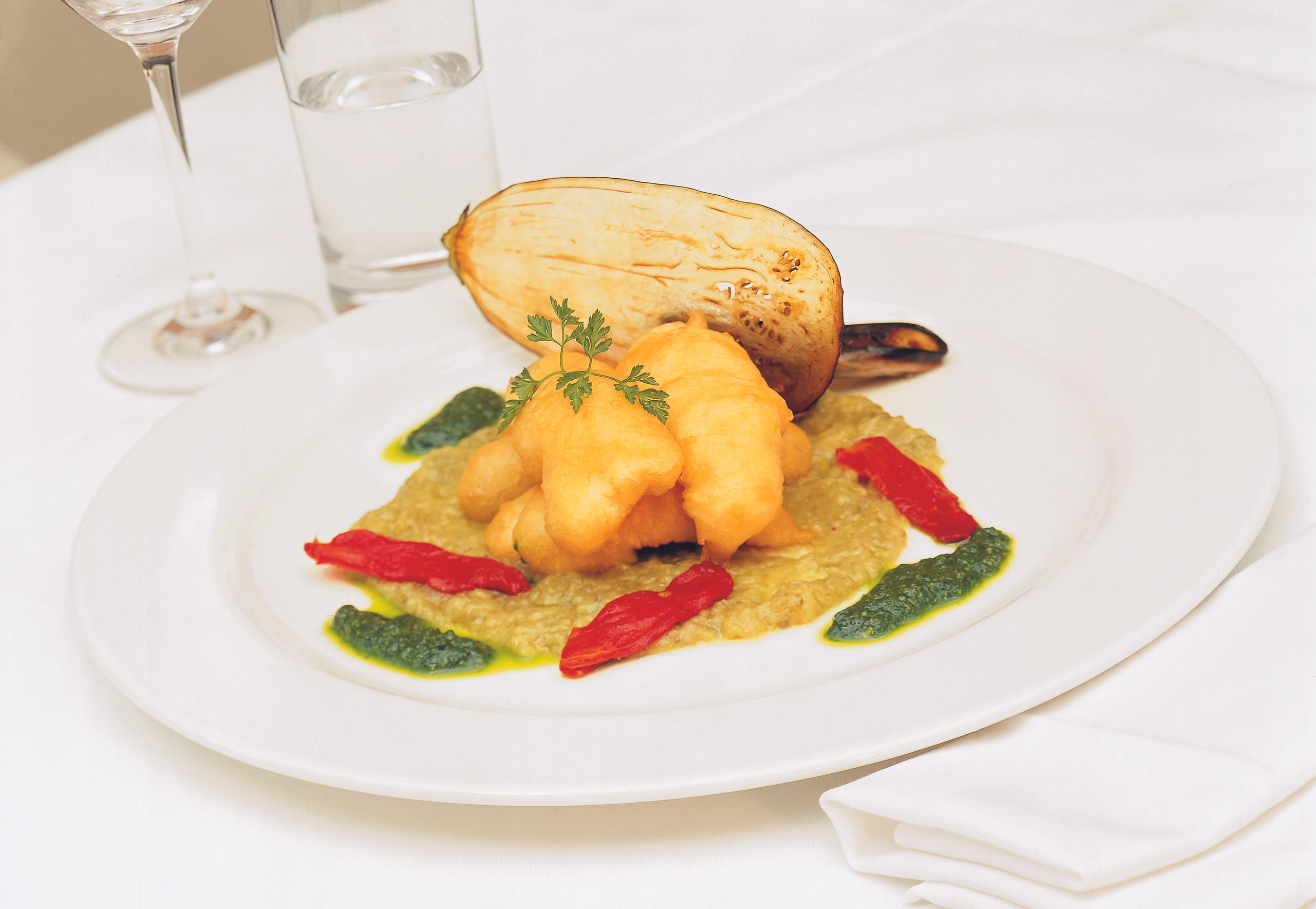 Seezungenbeignets mit Melanzani-Kaviar