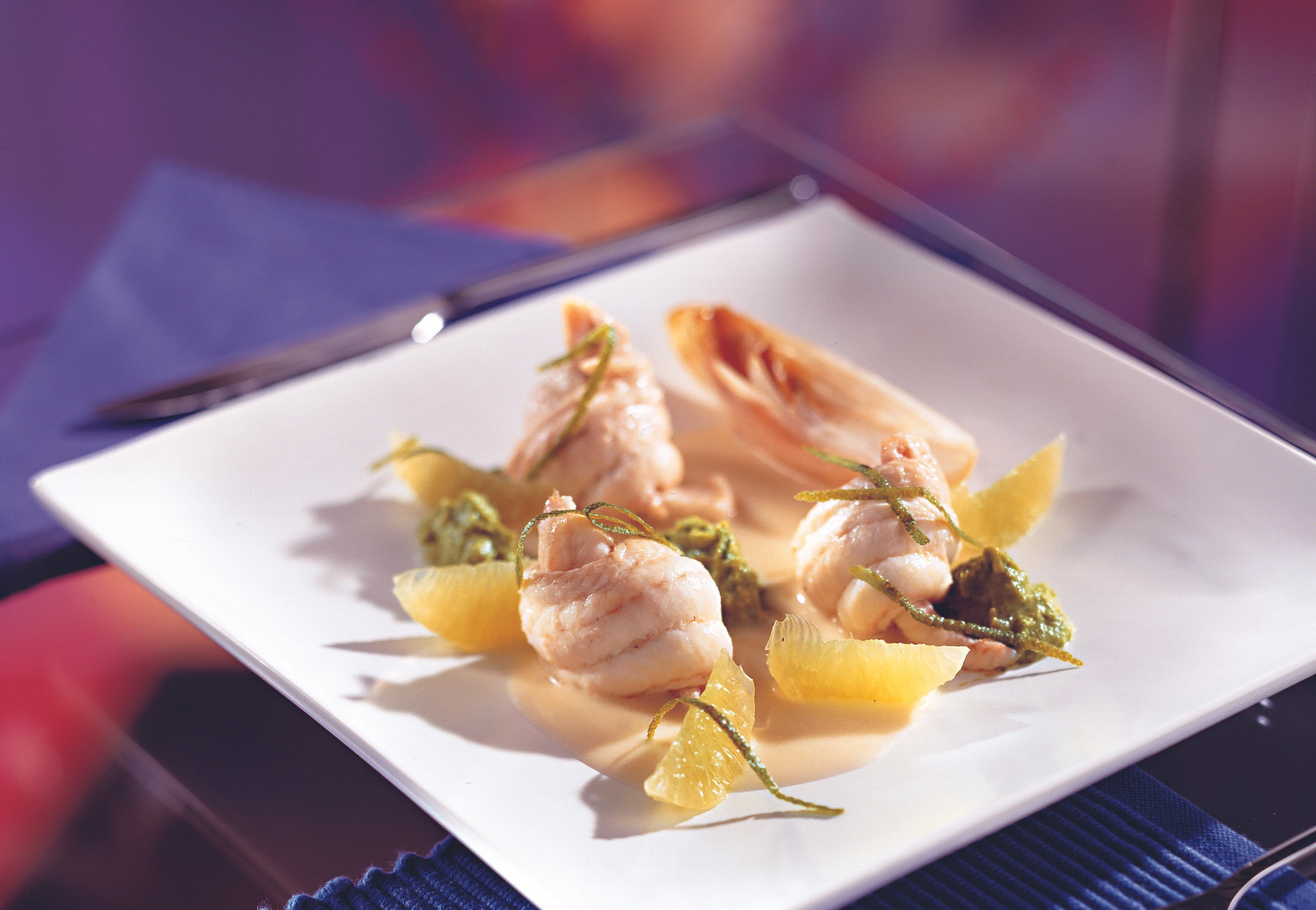 Sauce aufkochen, Limettensaft und den beim Fischdämpfen entstandenen Fond zugeben. Sauce abschmecken und aufmixen. Limettenfilets in die Sauce legen. Seezunge mit Sauce, Chicorée und Erbsenpüree anrichten.
