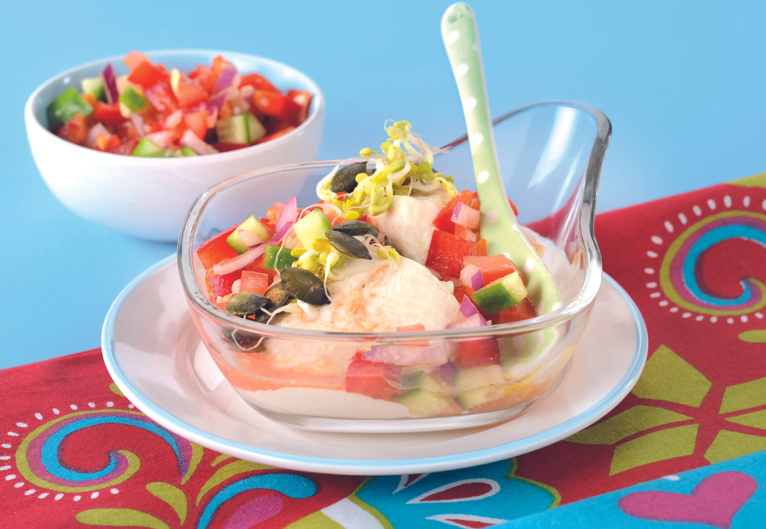 - Paradeiser, Paprika, Gurke, Zwiebel und Knoblauch mit 2 EL weißem Balsamico und 1 EL Olivenöl vermischen. Salsa mit Salz und Pfeffer abschmecken und etwas ziehen lassen.