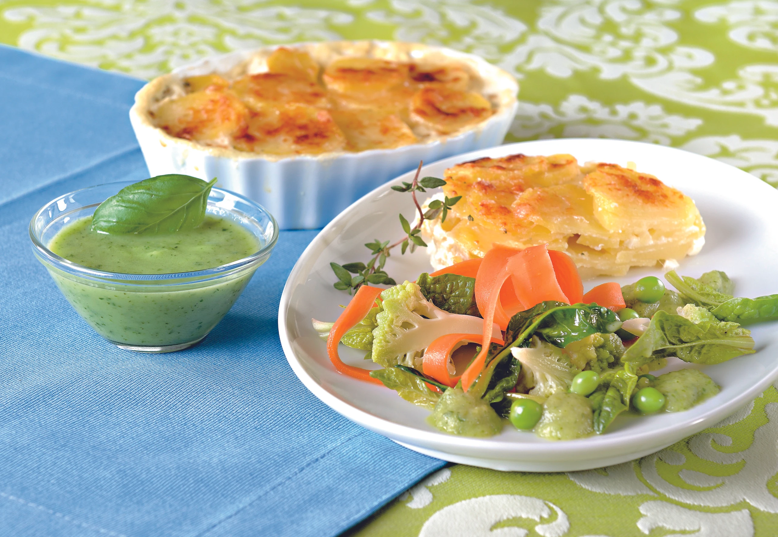 Sekunden-Spinat mit grünem Gemüse, Erdäpfelgratin und Zucchinisauce