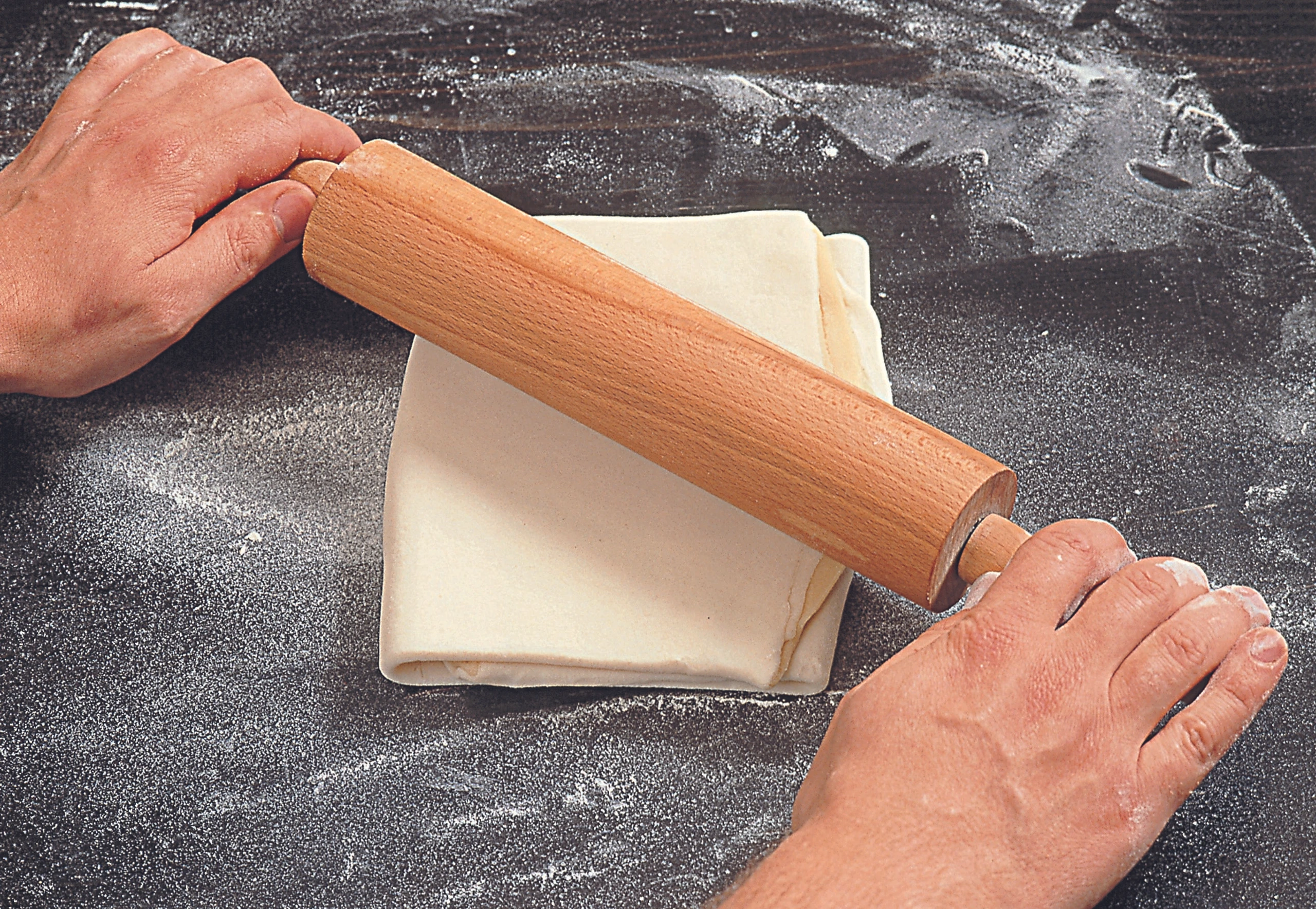 Teig und Butter aus dem Kühlschrank nehmen. Den Teig auf einer leicht bemehlten Arbeitsfläche doppelt so lang ausrollen wie die Butter (ca. 40 x 20 cm). Butter auf die untere Teighälfte legen, obere Teighälfte darüberfalten. Mit den Fingern den Teigrand vorsichtig verschließen, sodass die Butter nicht mehr zu sehen ist.
