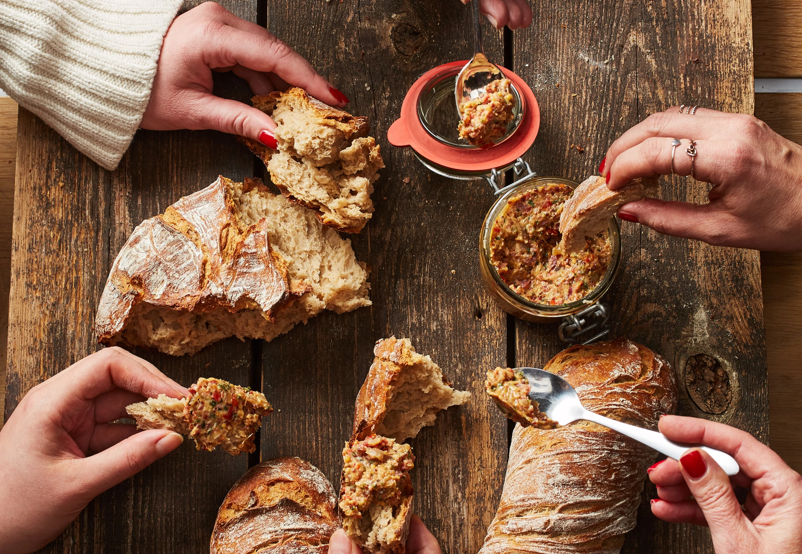 Zwiebeln und Knoblauch schälen. Paprika längs halbieren und die Kerne entfernen. Zwiebeln, Knoblauch und Paprika klein würfeln. Selchfleisch in ca. 0,5 cm große Stücke schneiden. Senfkörner in Salzwasser kochen, abseihen und abtropfen lassen. Schnittlauch fein schneiden.