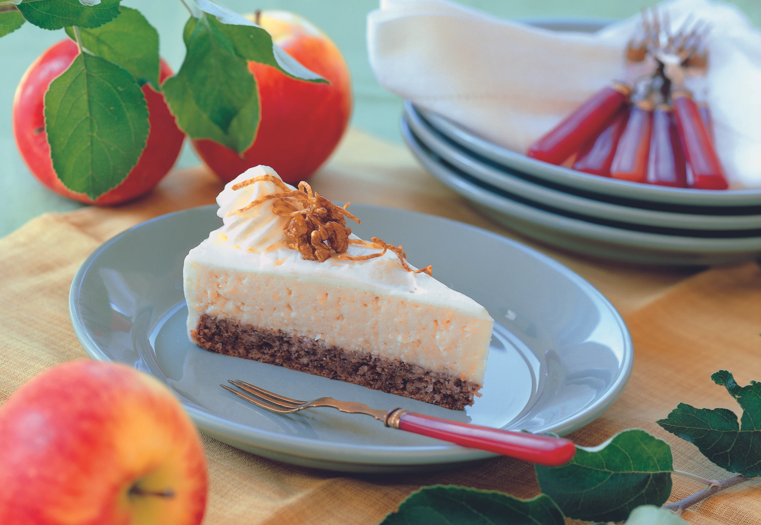 - Gelatine in kaltem Wasser einweichen. Orangenlikör erwärmen, Gelatine ausdrücken, darin auflösen und rasch in die Joghurtmasse rühren. Äpfel einrühren. Obers schlagen und unterheben. Creme auf dem Nussboden verstreichen. Torte mit Frischhaltefolie zudecken und ca. 8 Stunden kühlen.