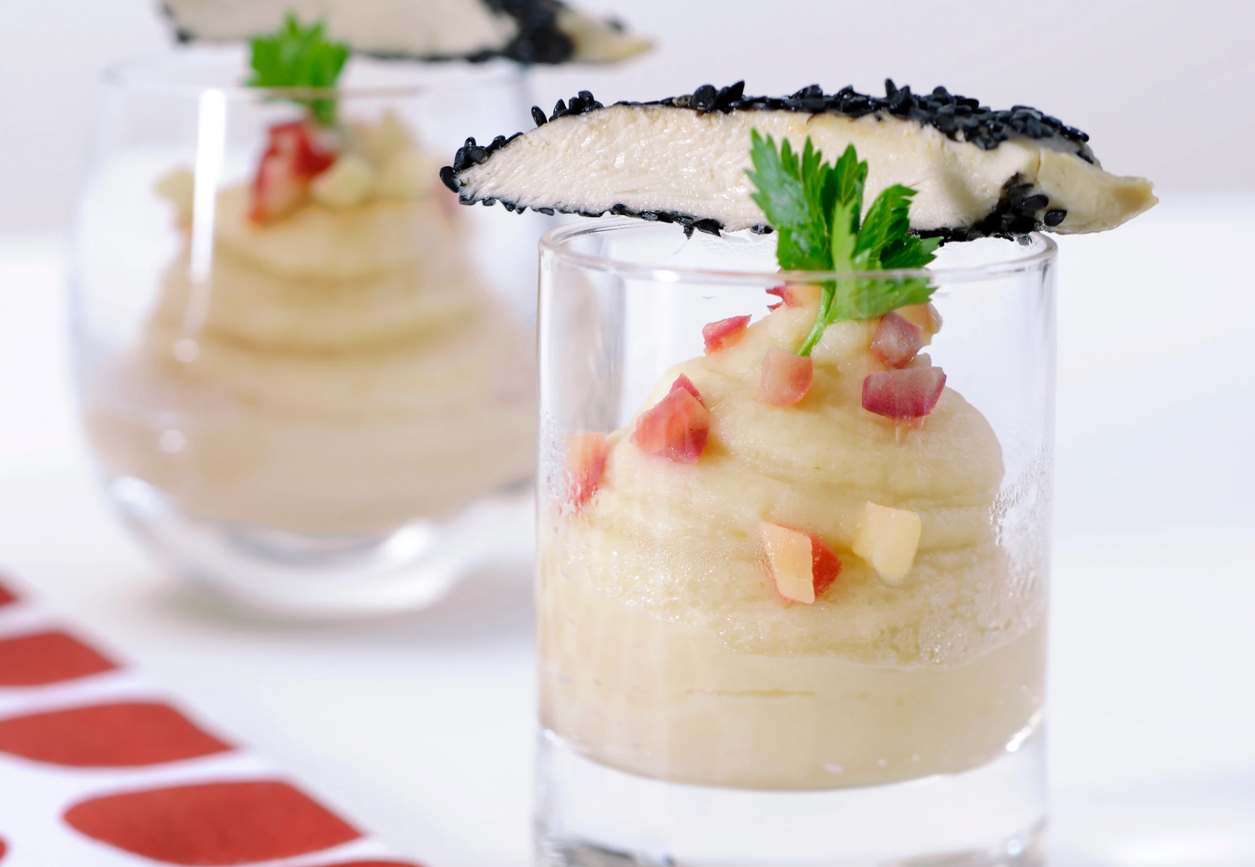 Filet salzen, pfeffern, in Sesam wälzen, in 4 Streifen schneiden und in heißem Öl anbraten. Parallel dazu Apfelstücke für die Garnitur in übriger Butter knackig braten. Püree mit Huhn und Apfelwürfeln garnieren.