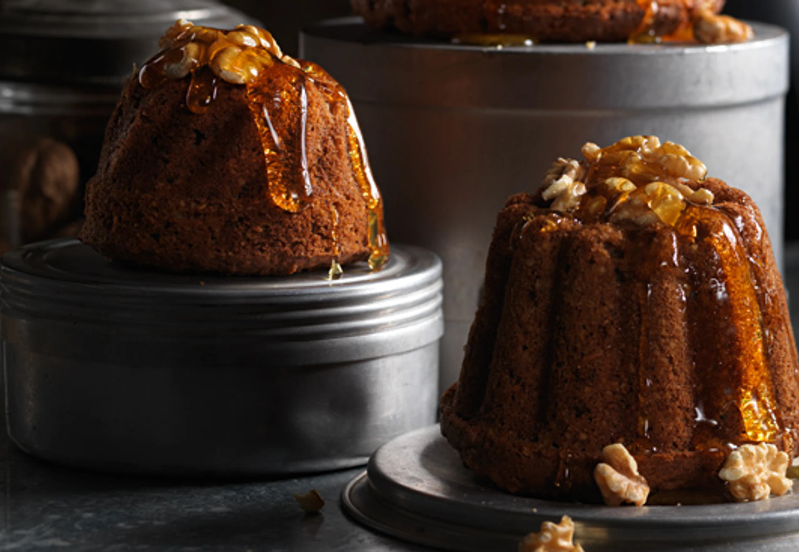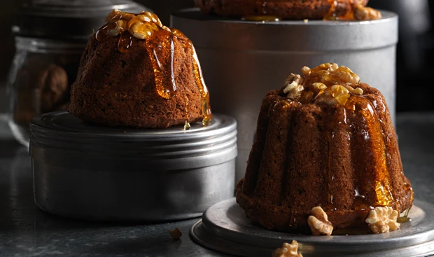 Herausnehmen und auskühlen lassen. Törtchen mit Ahornsirup und Nüssen garnieren.