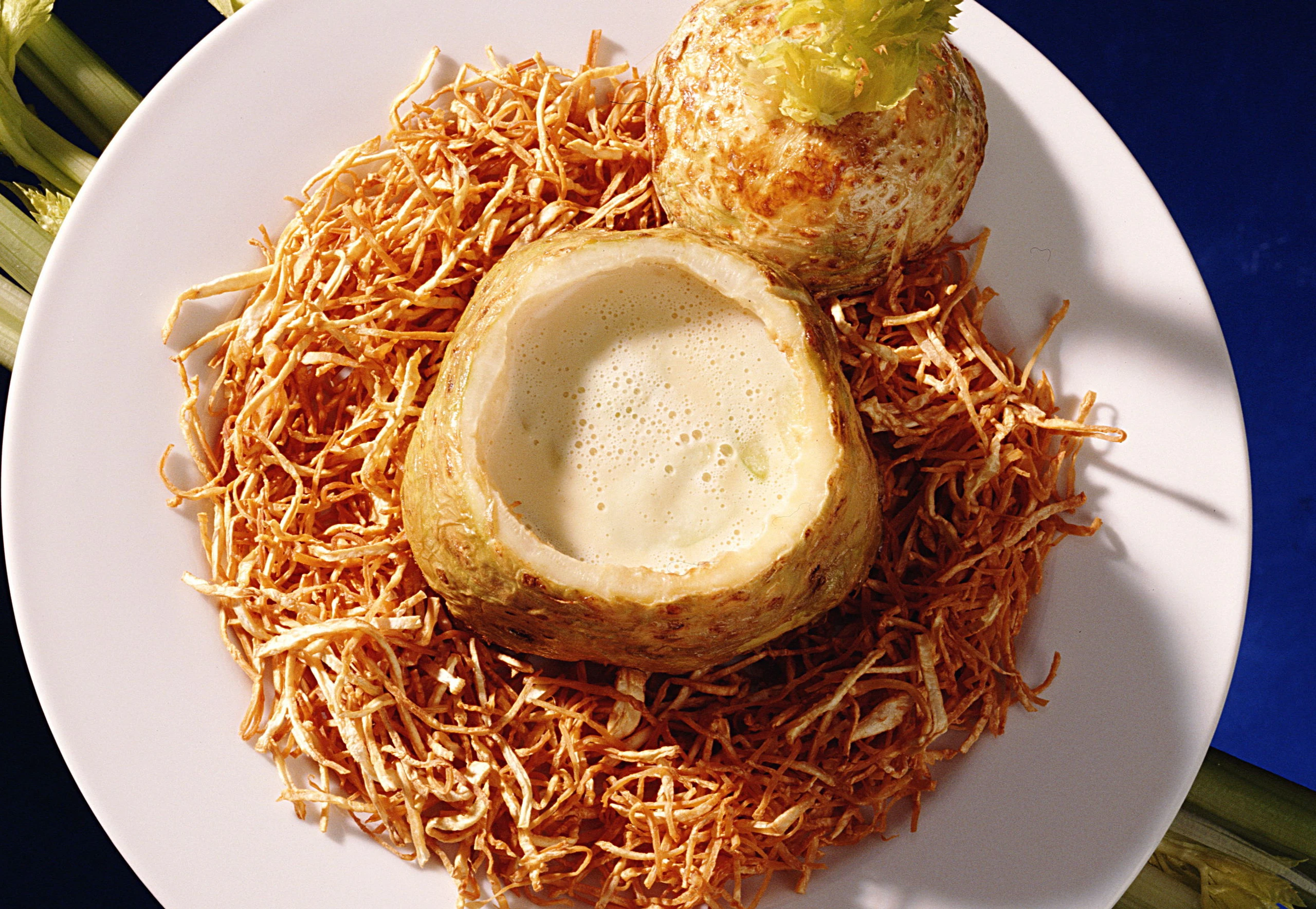 Suppe mit einem Stabmixer pürieren, durch ein feines Sieb streichen und nochmals aufkochen. (Sollte die Suppe zu dick sein, mit ein wenig Hühnersuppe verdünnen.) Geschlagenes Obers unter die Suppe heben und eventuell nachwürzen. Sellerieknollen auf Teller setzen, Suppe einfüllen, mit den Deckeln zudecken und rasch servieren.