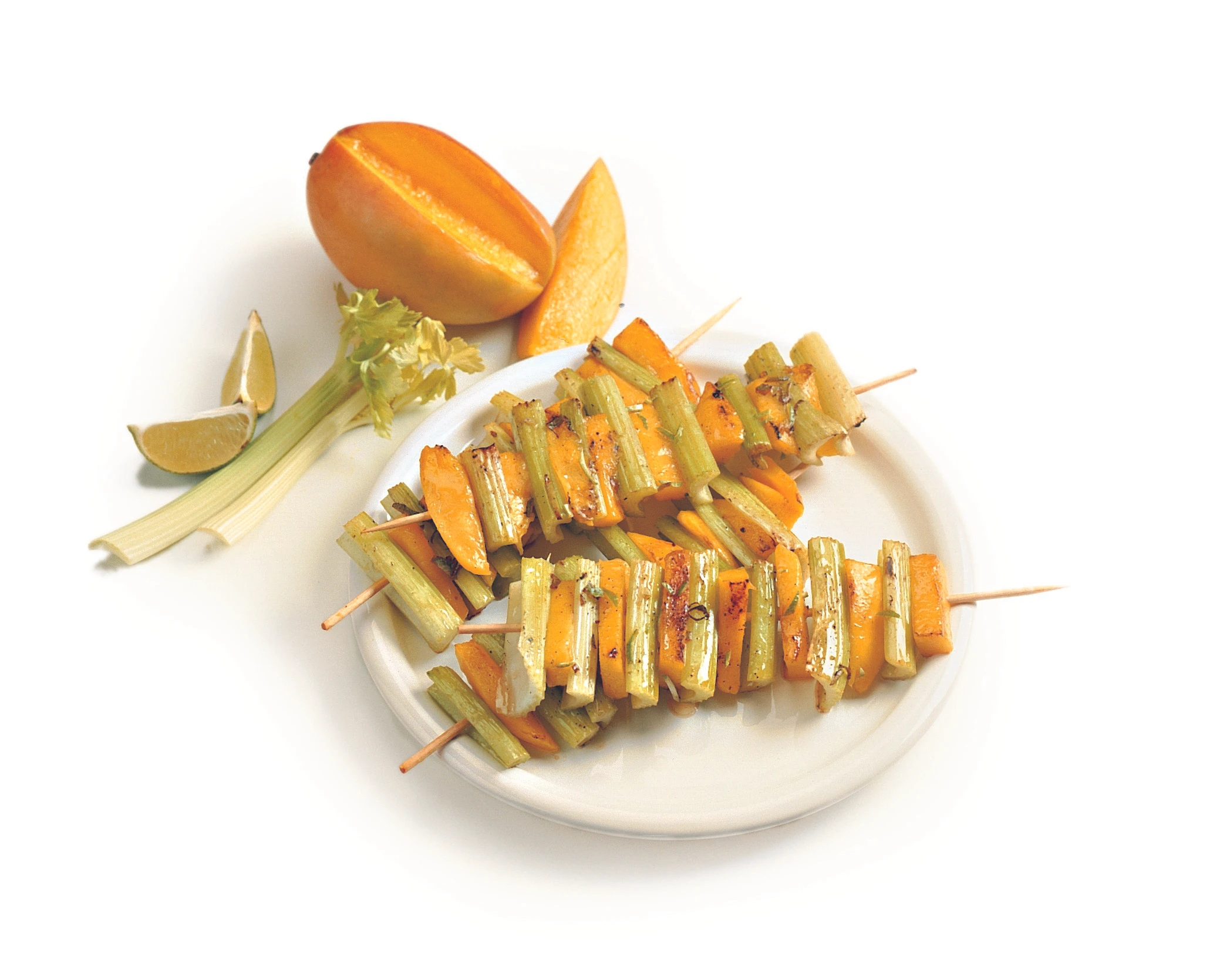 Sellerie und Mango schälen, Mangofruchtfleisch vom Kern schneiden. Sellerie und Mango in gleich große Stücke schneiden und abwechselnd auf Spieße stecken.