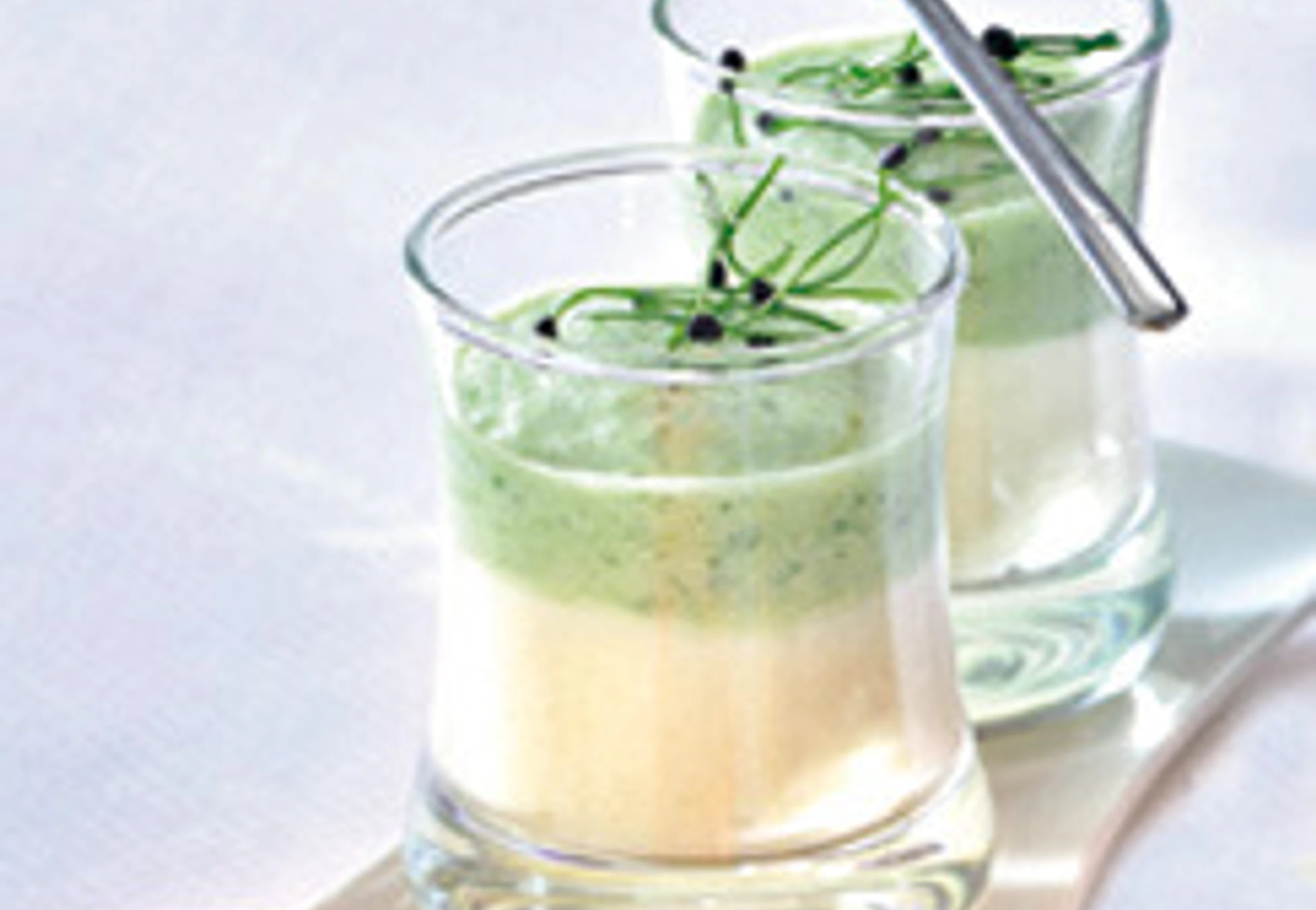 - Weiße Selleriesuppe in Gläser füllen, grüne Suppe vorsichtig darauffüllen, mit Kresse oder Sprossen garnieren.