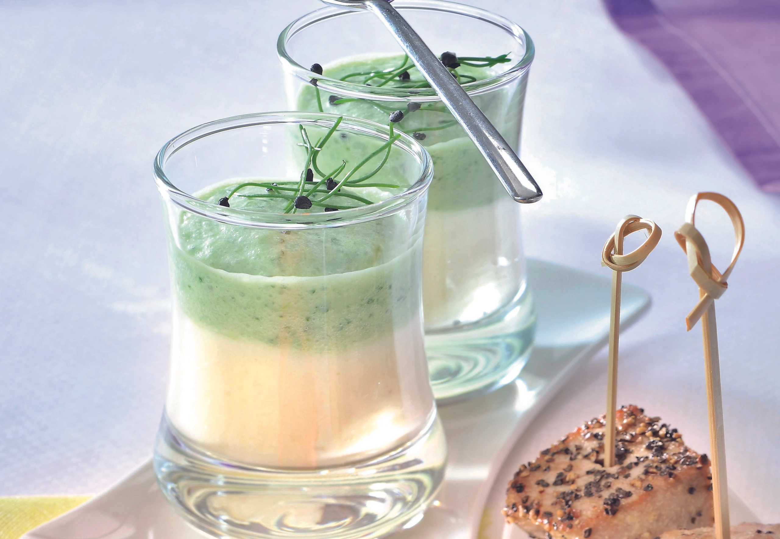 Weiße Selleriesuppe in Gläser füllen, grüne Suppe vorsichtig darauffüllen, mit Kresse oder Sprossen garnieren.