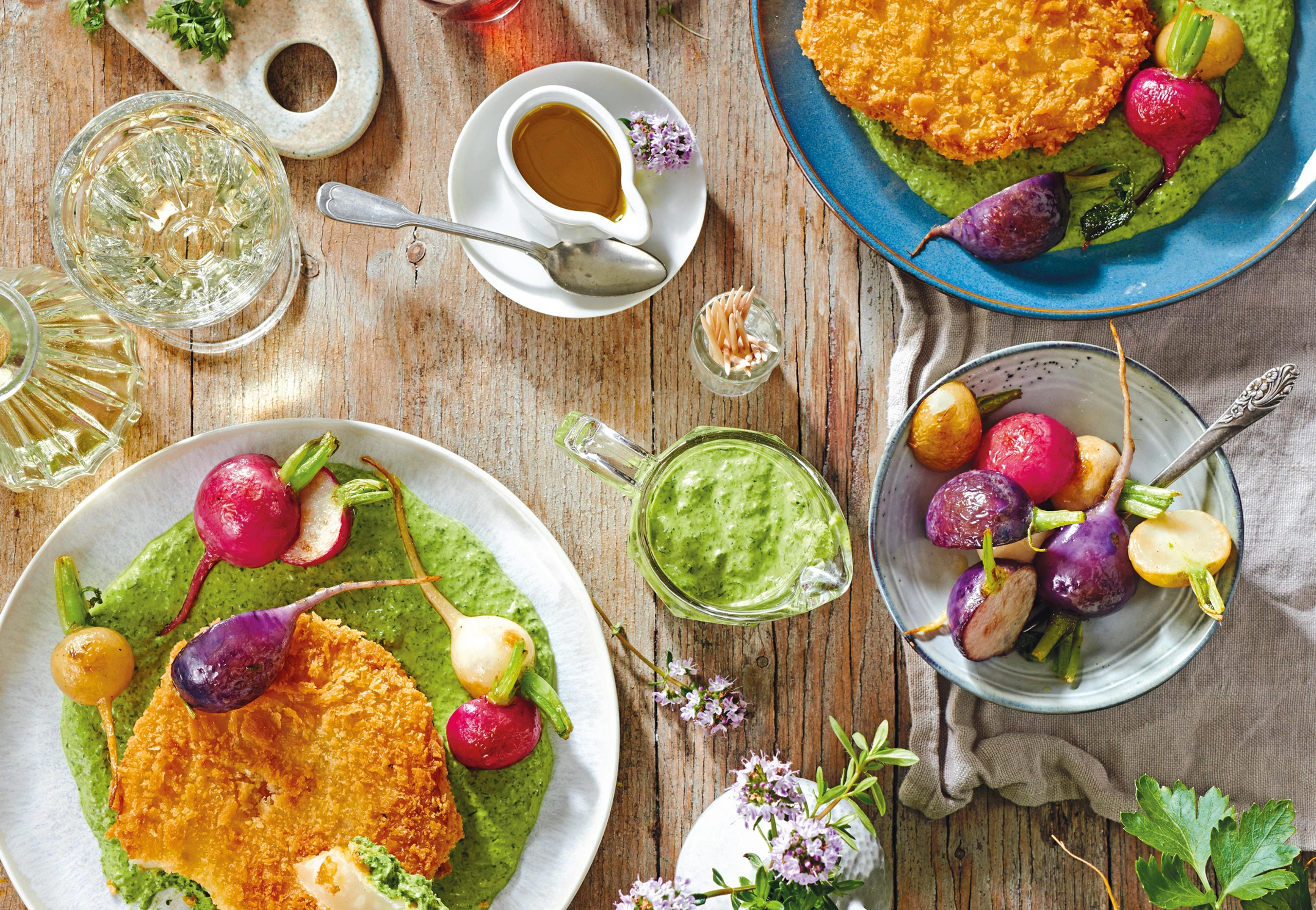 Sellerie-Schnitzel mit Frankfurter Grüne Sauce & gerösteten Radieschen