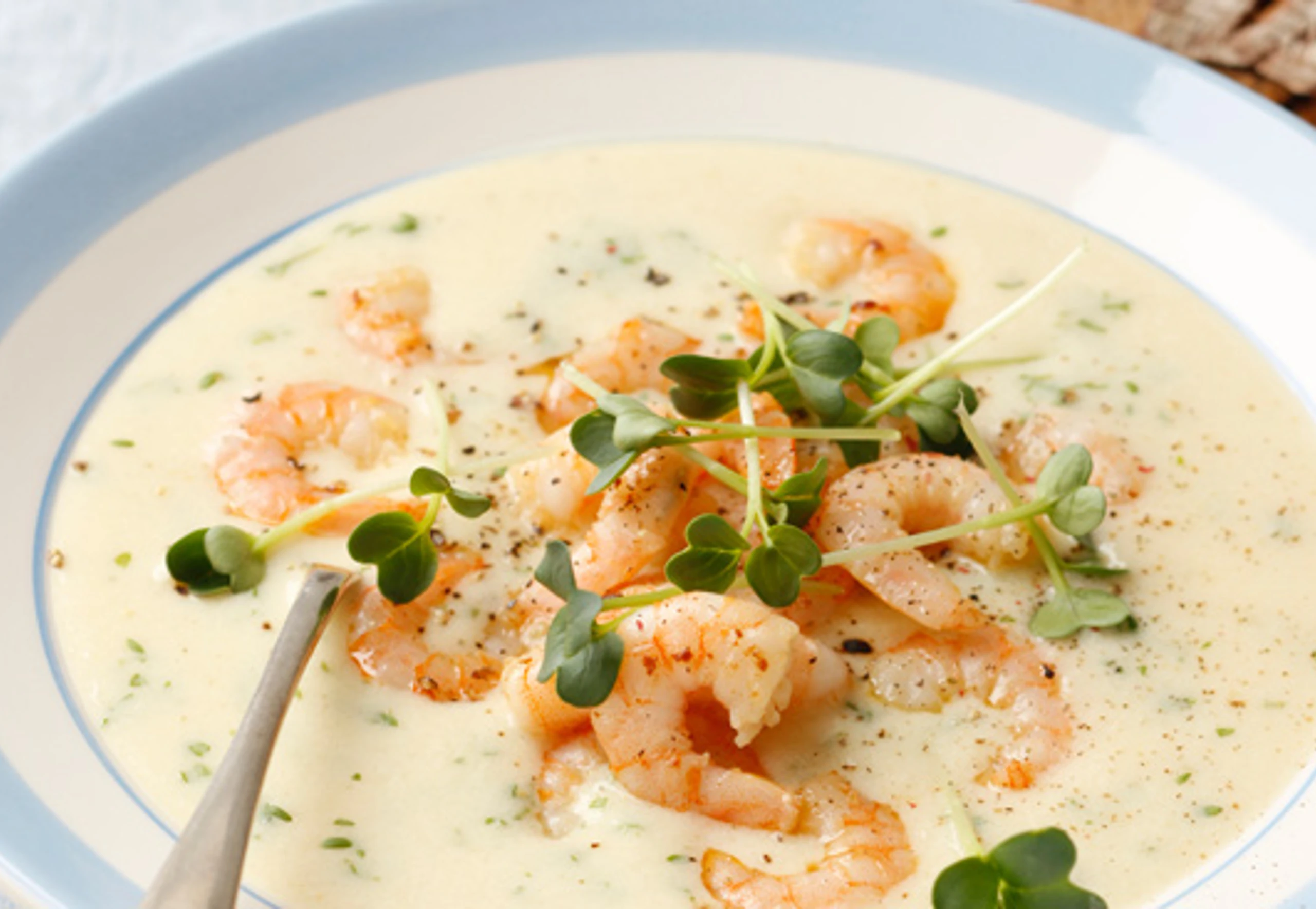 Suppe mit dem Stabmixer fein pürieren, mit Salz, Pfeffer und Zitronensaft würzen. Gehackte Kresse einrühren. Suppe mit den Shrimps anrichten, pfeffern und mit übriger Kresse bestreut servieren.