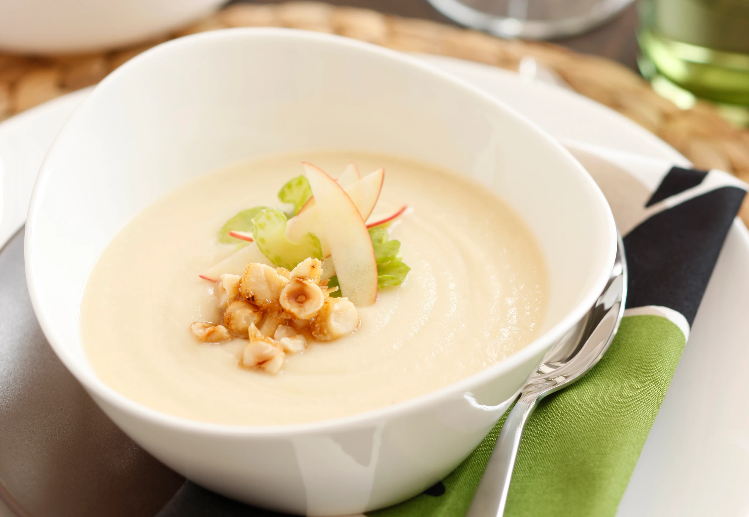 Suppe aufkochen, anrichten, mit Nüssen, Apfelspalten, Selleriescheiben und -grün garnieren.