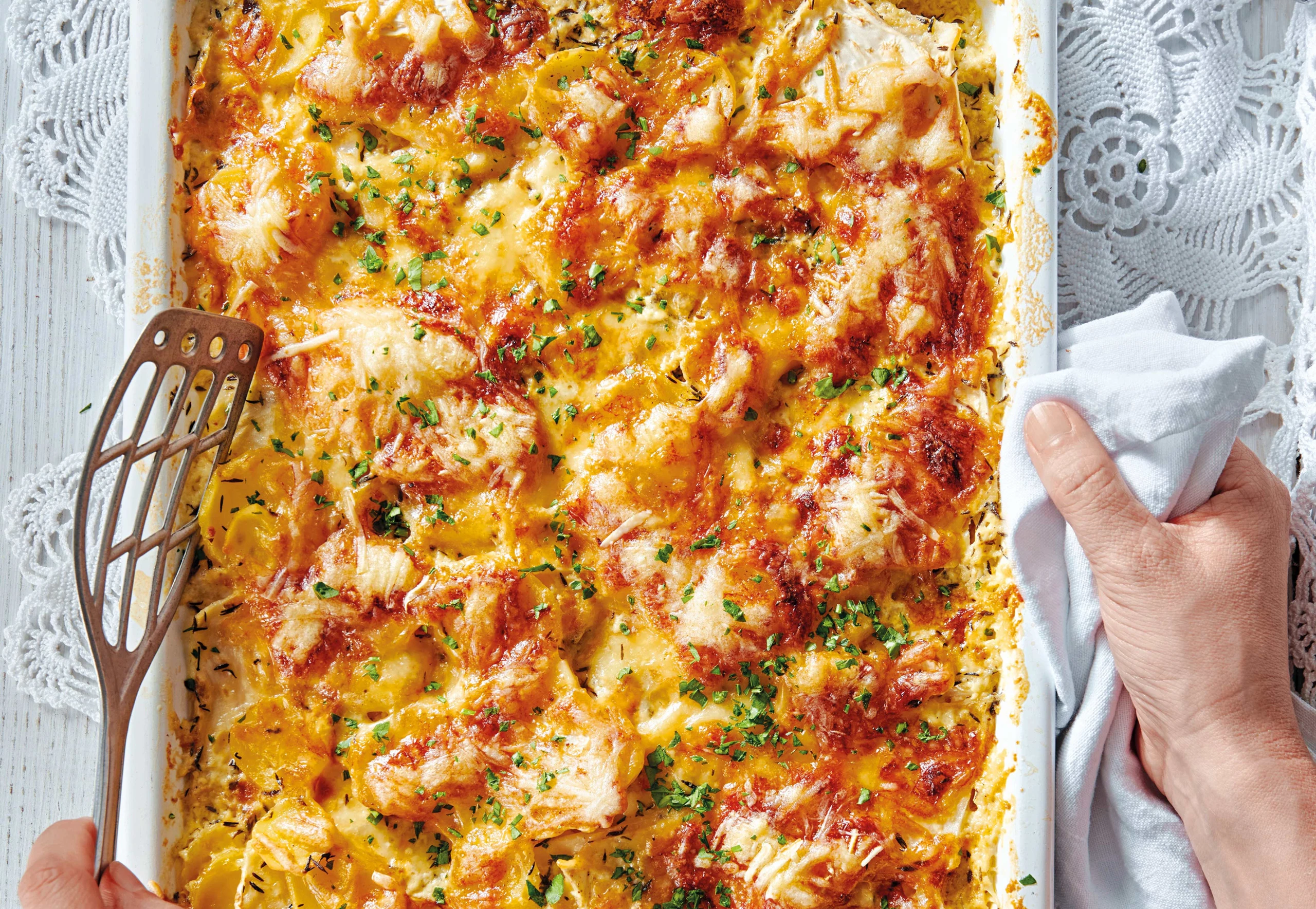 Im Rohr (mittlere Schiene / Gitterrost) ca. 1 Stunde backen, bis der Käse goldbraun ist. Herausnehmen und mit Petersilie bestreuen.