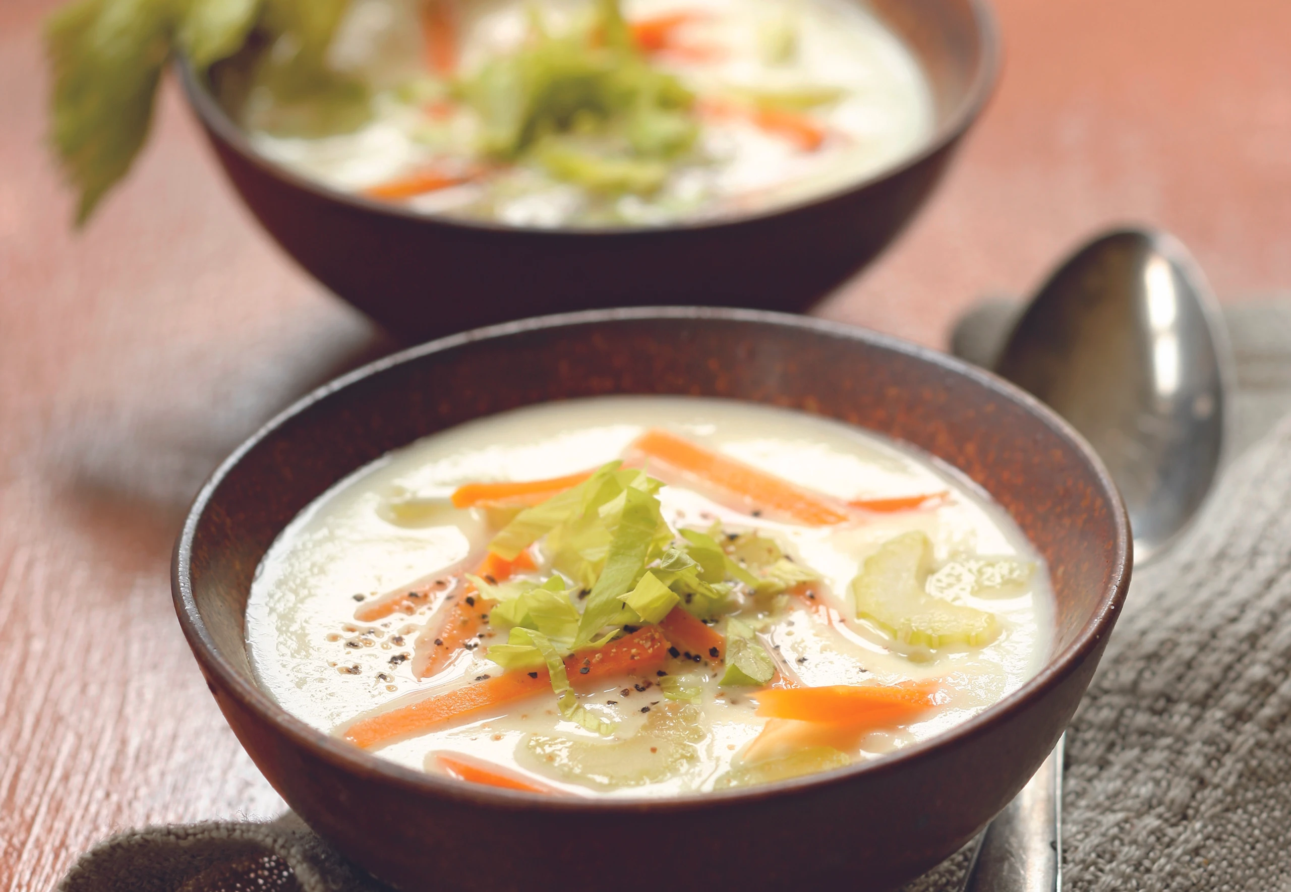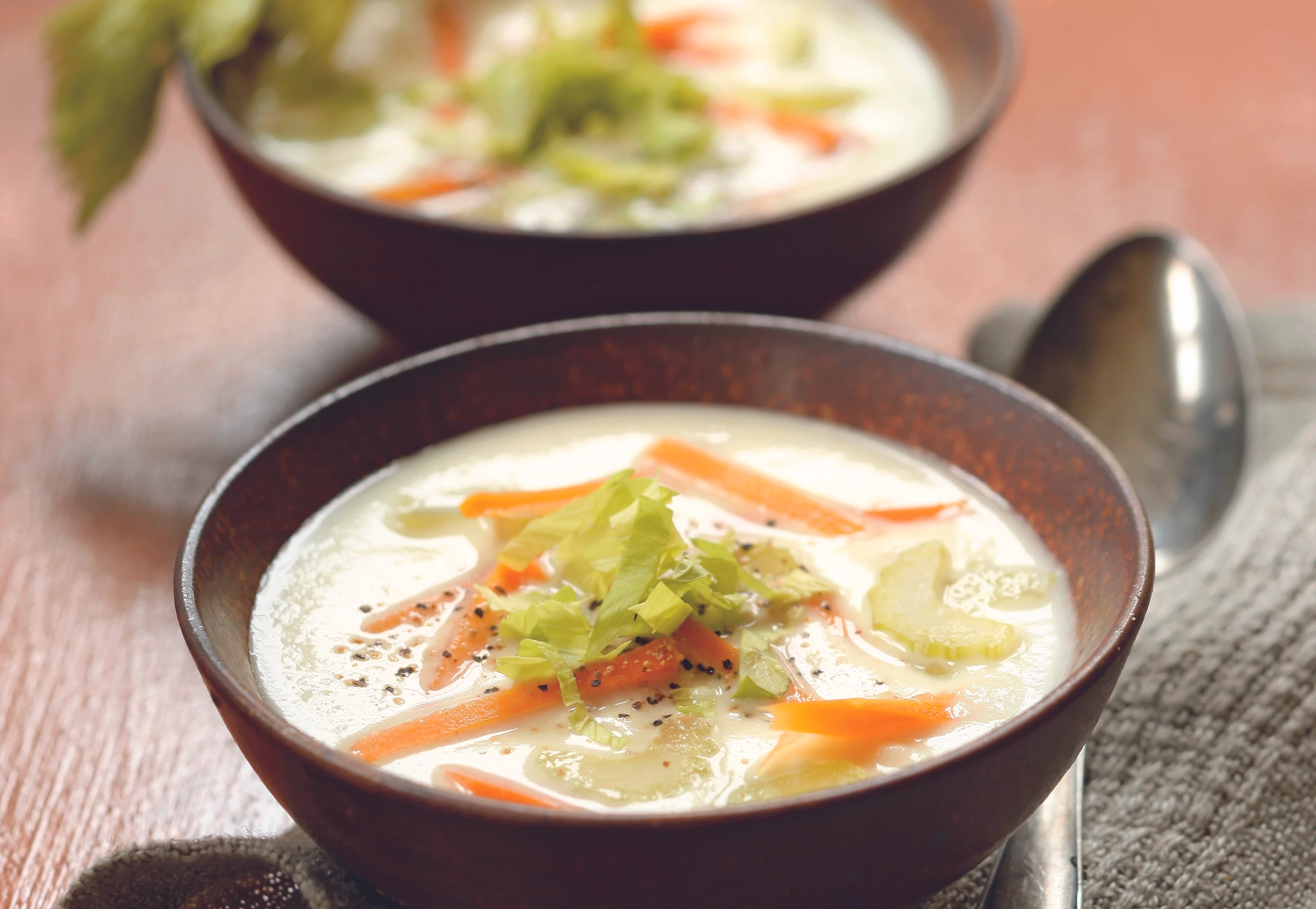 Suppe mit einem Stabmixer fein pürieren, mit Salz, Pfeffer, Muskat und Zitronensaft würzen. Gemüse und Selleriegrün in die Suppe rühren. Suppe anrichten.