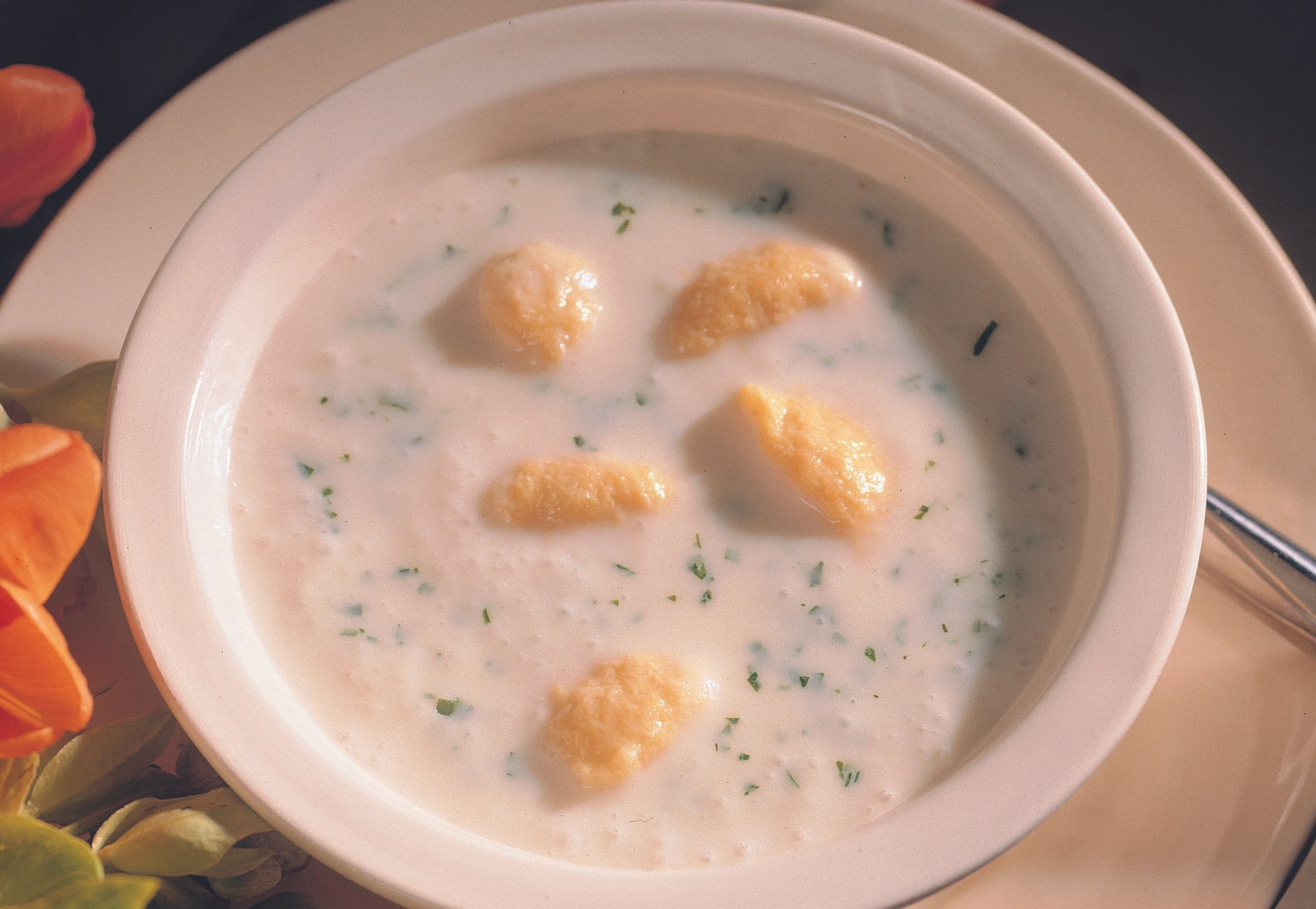 Sellerie und Zwiebel schälen, klein schneiden und in 1 EL Butter anschwitzen. Gemüse mit Suppe und Obers aufgießen und auf kleiner Flamme ca. 20 Minuten köcheln.