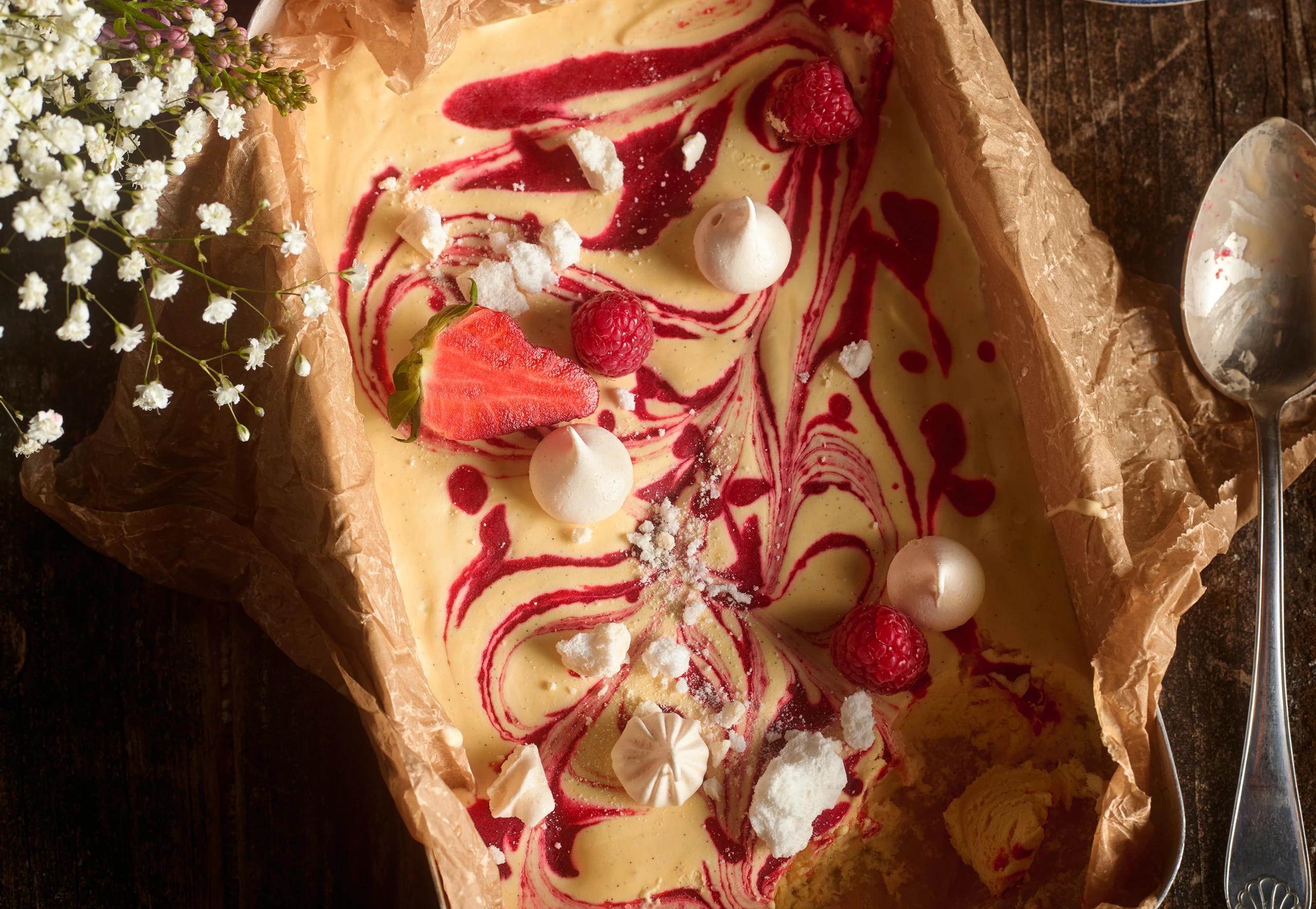 Masse ca. 3 Stunden tiefkühlen. Dessert ca. 20 Minuten vor dem Servieren herausnehmen und mit Baiser und Erdbeeren belegen.