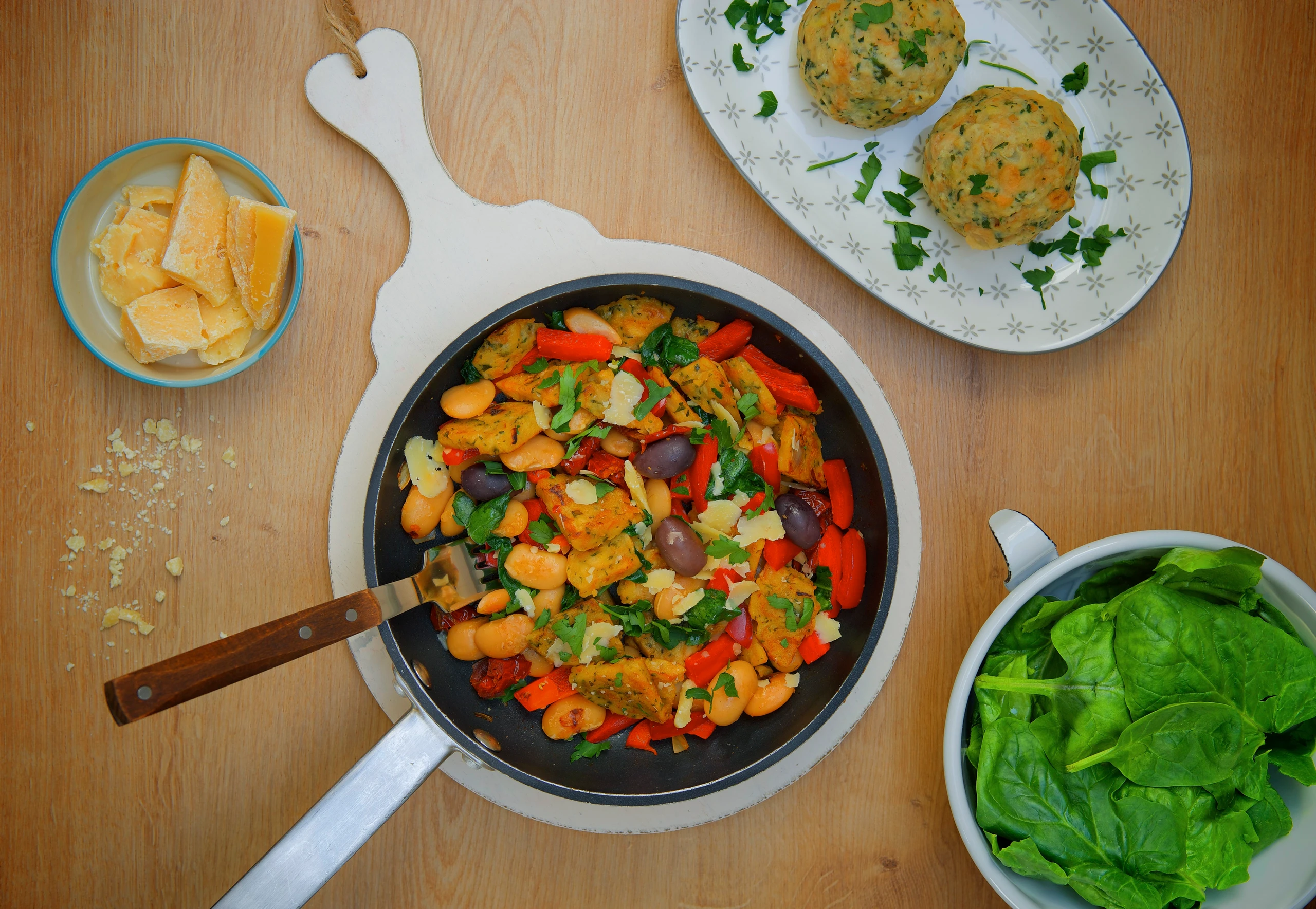 In einer Pfanne Olivenöl erhitzen, Knödel und Bohnen darin knusprig anbraten. Paprika, Paradeiser und Oliven zugeben, kurz mitbraten. Spinat untermischen und durchschwenken. Gröstl salzen, pfeffern und mit Parmesan bestreuen.