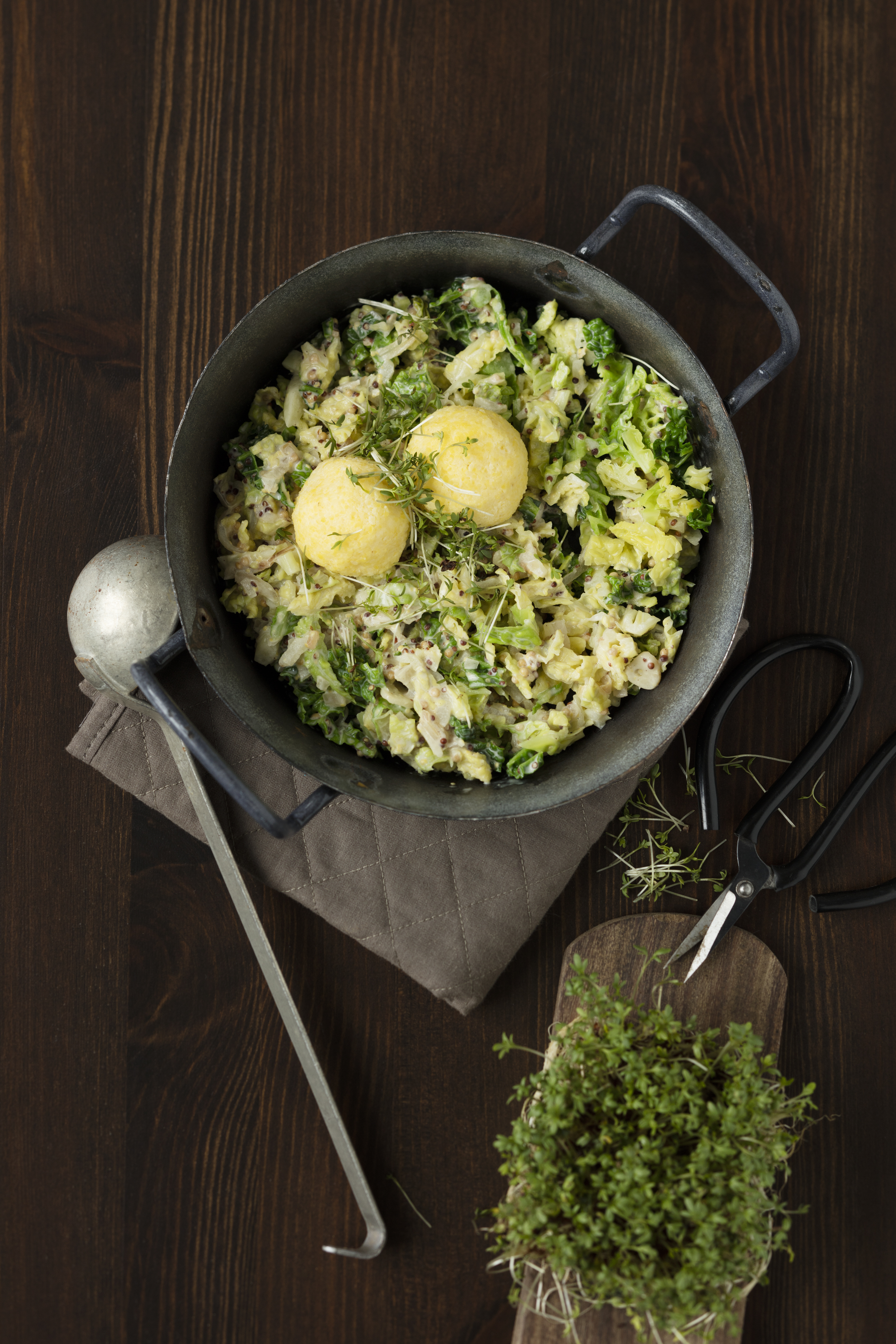 Aus der Polentamasse 8 Knödel formen, in schwach wallendem Salzwasser ca. 5 Minuten ziehen lassen. Kohl mit Knödeln und Kresse garniert servieren.