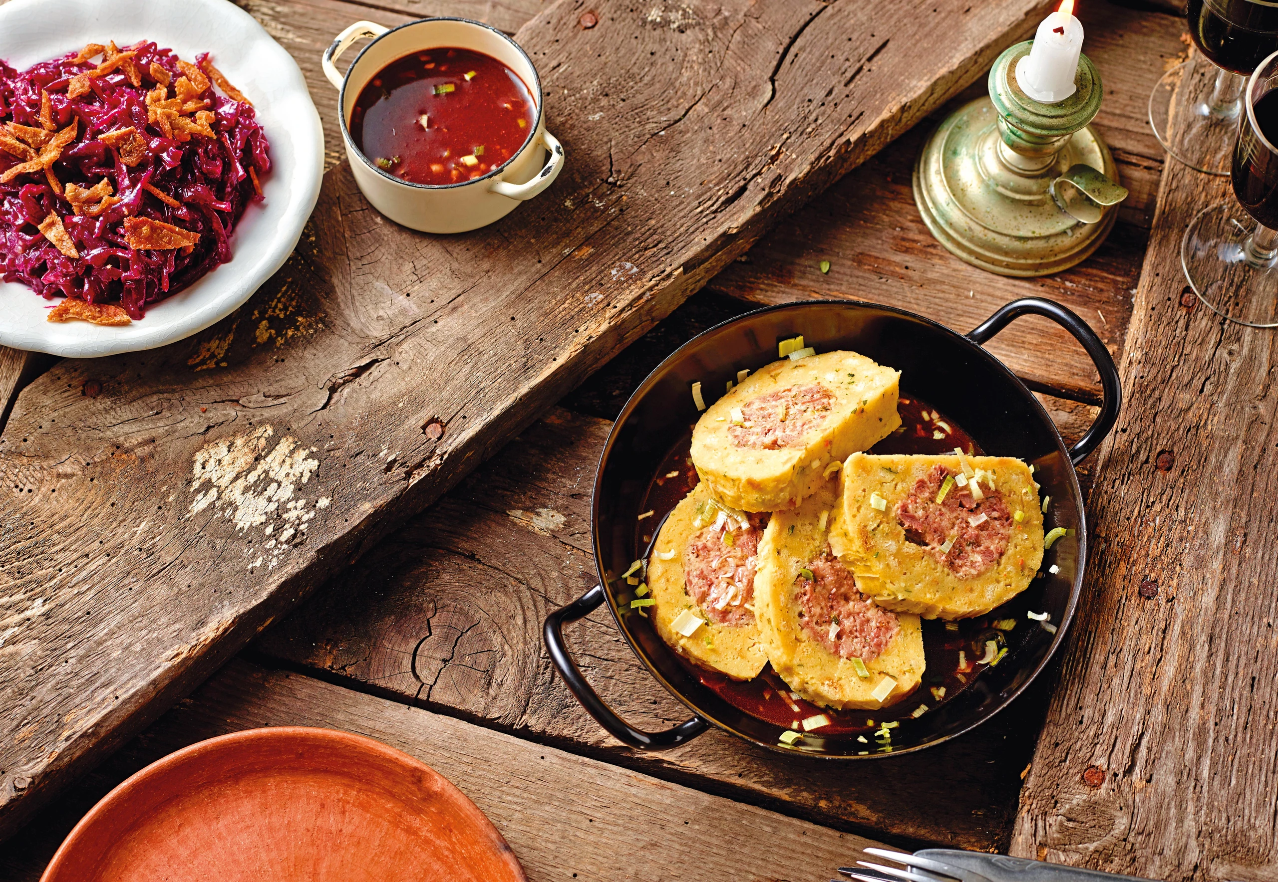 Serviettenknödel mit Ganslfülle, Portweinsauce und Hagebutten-Rotkraut