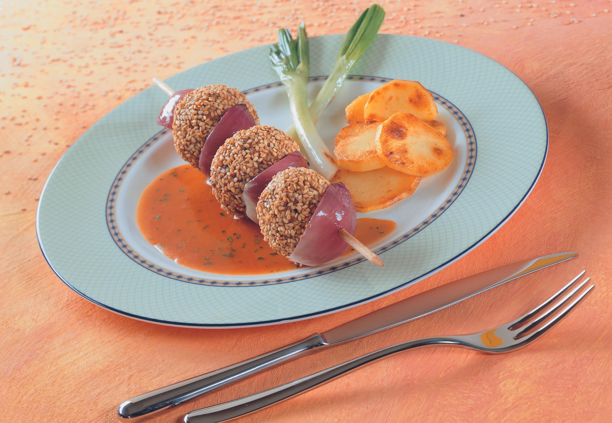 Faschiertes mit 100 g vom Sesam, 1 Ei, Zwiebelmischung und Bröseln vermischen. 12 gleich große Kugeln daraus formen und nacheinander in Mehl, übrigem Ei (verquirlt) und Sesam wenden. Je 3 Kugeln abwechselnd mit 4 Zwiebelstücken auf Spieße stecken.