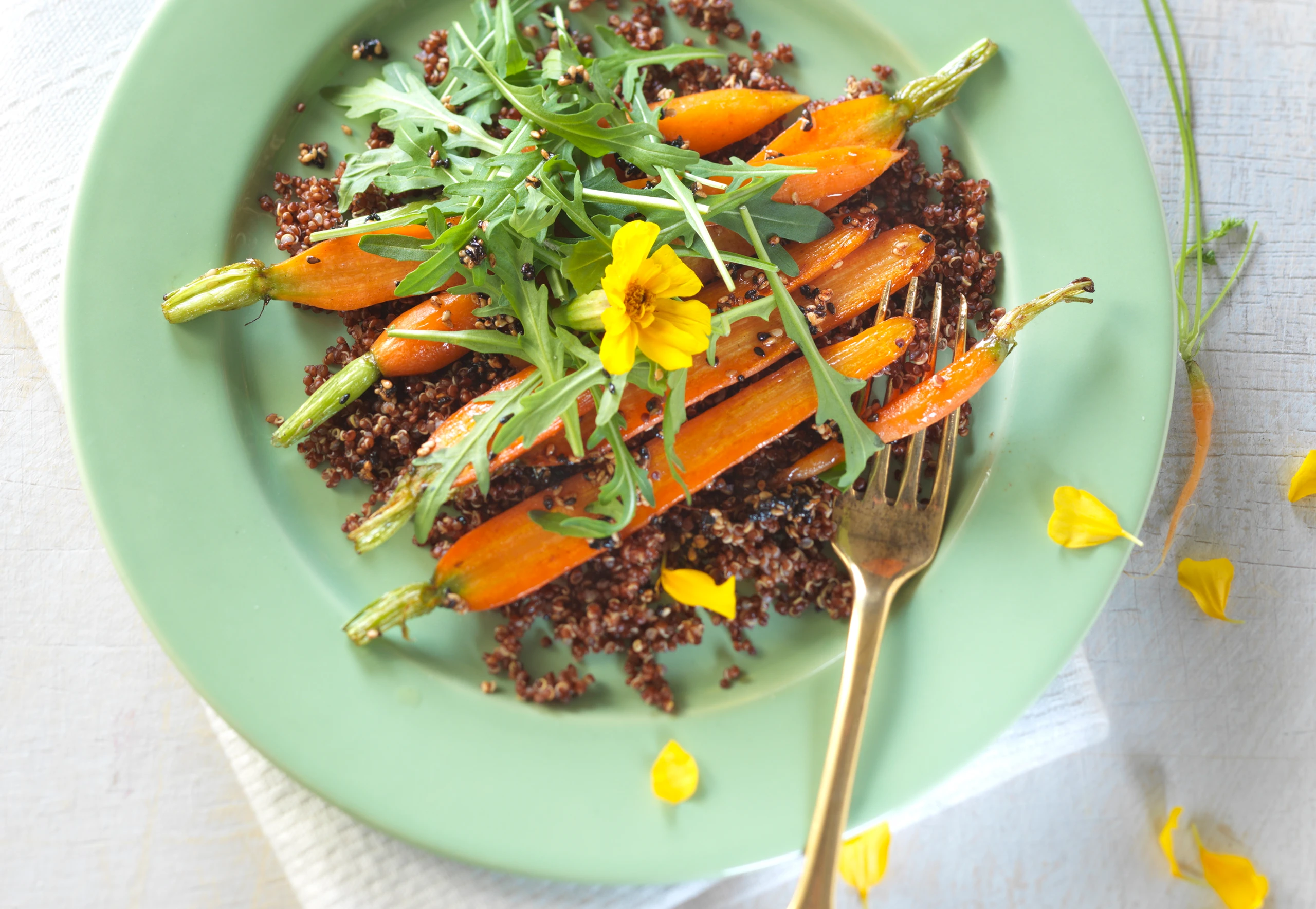 - Quinoa salzen und auf Tellern verteilen. Karotten darauf legen. Rucola putzen. Olivenöl mit Zitronensaft, 1 MS Honig und wenig Salz verrühren, Rucola damit marinieren und mit den Karotten anrichten.