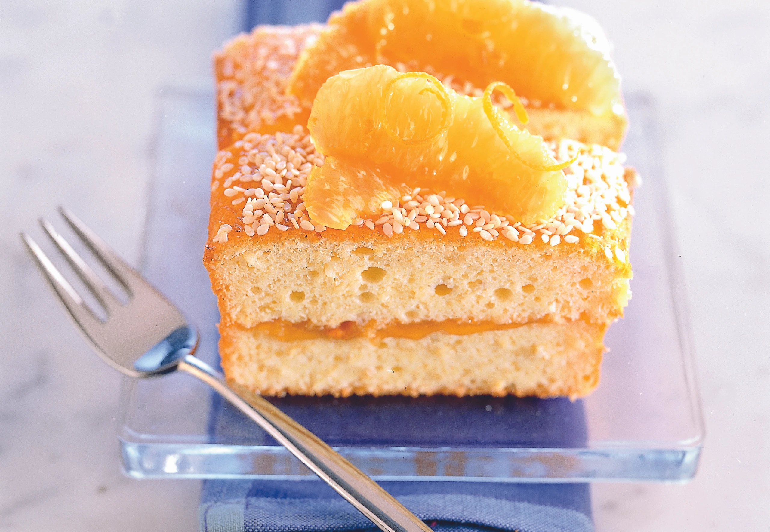 Kuchen einmal horizontal durchschneiden. Mit Orangenmarmelade füllen, ca. 1 EL zurückhalten und die Kuchenoberfläche damit einstreichen. Kuchen mit Sesam bestreuen, mit je einem Orangenfilet garniert anrichten.